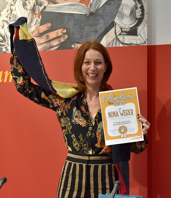 "Lebendig und ausdrucksstark – so ist Nina Weger, wenn sie auf der Bühne ihre Figuren verkörpert. Als ehemalige Zirkuskünstlerin untermalt sie ihre Lesungen immer auch mit kurzen Akrobatikeinlagen. Sie lebt ihre Figuren, geht auf ihr Publikum ein und begeistert so nicht nur die jüngeren Leser, sondern zieht auch Jugendliche in den Bann. Das macht Nina Weger zu einer wahren Lesekünstlerin", sagt Irmgard Clausen, Vorsitzende der IG Leseförderung und Jurymitglied.