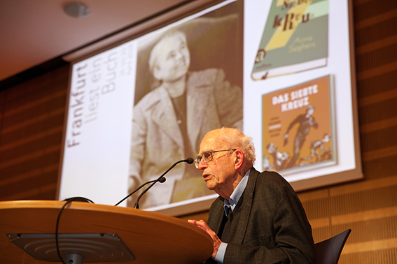 Der Vortragssaal der Deutschen Nationalbibliothek war gestern Abend zur offiziellen Eröffnungsveranstaltung des Lesefestivals "Frankfurt liest ein Buch" mit rund 400 Zuhörern voll besetzt. Auf der Leinwand hinter dem Podium sah man das Cover des Titels, der diesmal in Frankfurt und der Region gelesen wird: "Das siebte Kreuz" (Aufbau Verlag) von Anna Seghers. Der 1938/39 im Exil geschriebene antifaschistische Roman beschreibt die Flucht von sieben politischen Häftlingen im Nazideutschland aus dem fiktiven KZ Westhofen bei Worms.
