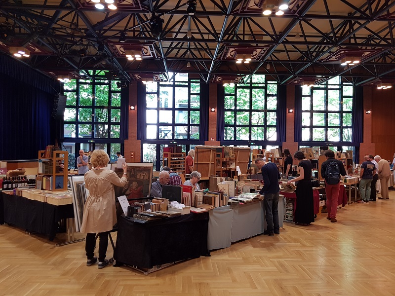 Der rund 760 Quadratmeter große Saal im Saalbau Bornheim bot einen passenden äußeren Rahmen für den 1. Frankfurter Antiquariatsmarkt (RHEIN-MAIN.Antiquaria) am gestrigen Sonntag. 25 Aussteller nahmen an der von Dirk Franken und Arnd Hepprich (Steeler Antiquariat, Essen) ausgerichteten Veranstaltung teil – darunter leider nur wenige aus dem Rhein-Main-Gebiet, darunter das auf Naturwissenschaften und Botanik spezialisierte Antiquariat Lycaste aus Dietzenbach.