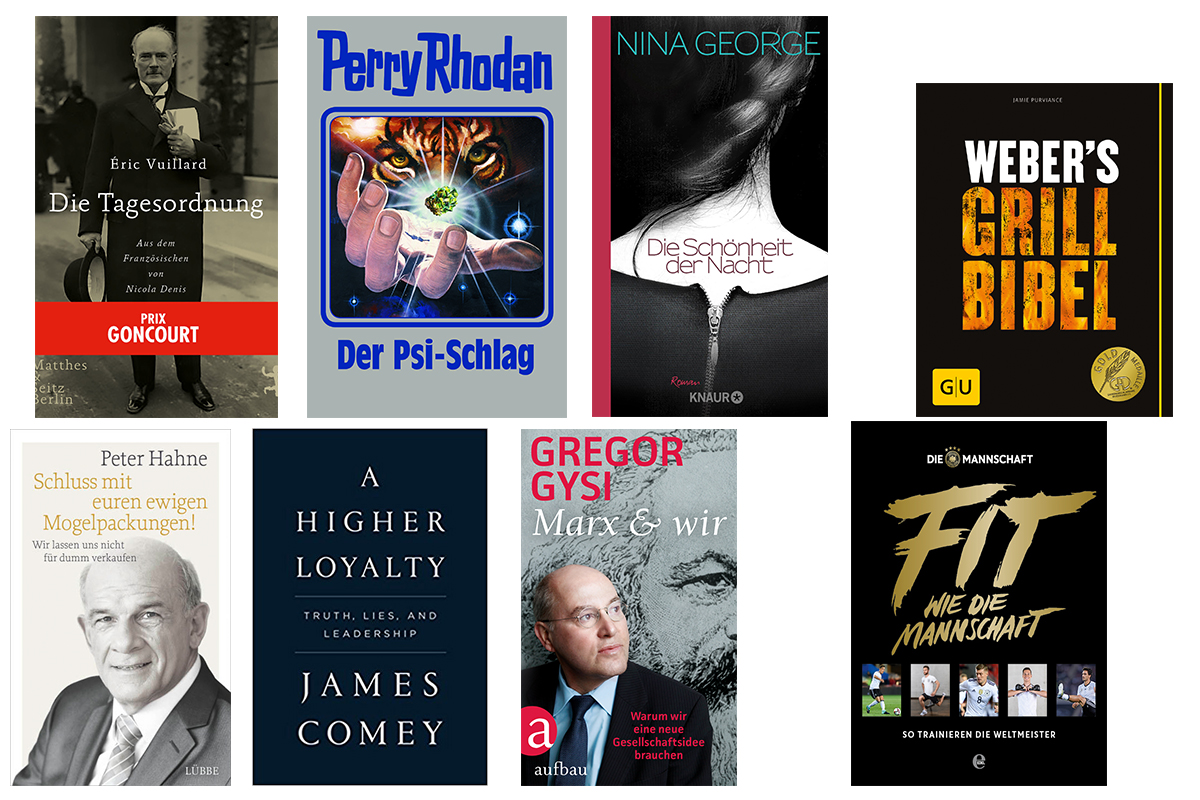 Neben der deutschen Übersetzung von "A Higher Loyalty“ ("Größer als das Amt", Droemer, Platz 3) steigt auch die Originalausgabe wieder in die Top 25 ein. Das Trump-Enthüllungsbuch, das durch James Comeys Tätigkeiten als Staatsanwalt und FBI-Direktor zugleich ein Panorama der USA zeichnet, verkauft sich im Nu. In den USA waren die ersten 800.000 Exemplare nach wenigen Tagen vergriffen. Hierzulande lässt Droemer (Startauflage: 80.000) ebenfalls nachdrucken.