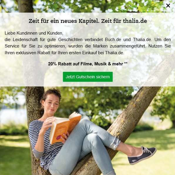 boersenblatt.net hat nachgeschaut: Die Eingabe von buch.de in den Webbrowser führt am 16. Mai auf thalia.de. Dort geht ein Pop-up-Fenster auf, das sich an die ehemaligen buch.de-Nutzer wendet: "Zeit für ein neues Kapitel. Zeit für thalia.de" ist Mitteilung an die Kunden überschrieben, die auf die Zusammenlegung verweist. Für den ersten Einkauf bei thalia.de erhalten Kunden einen Rabatt-Gutschein (ausgenommen sind Bücher und E-Books).