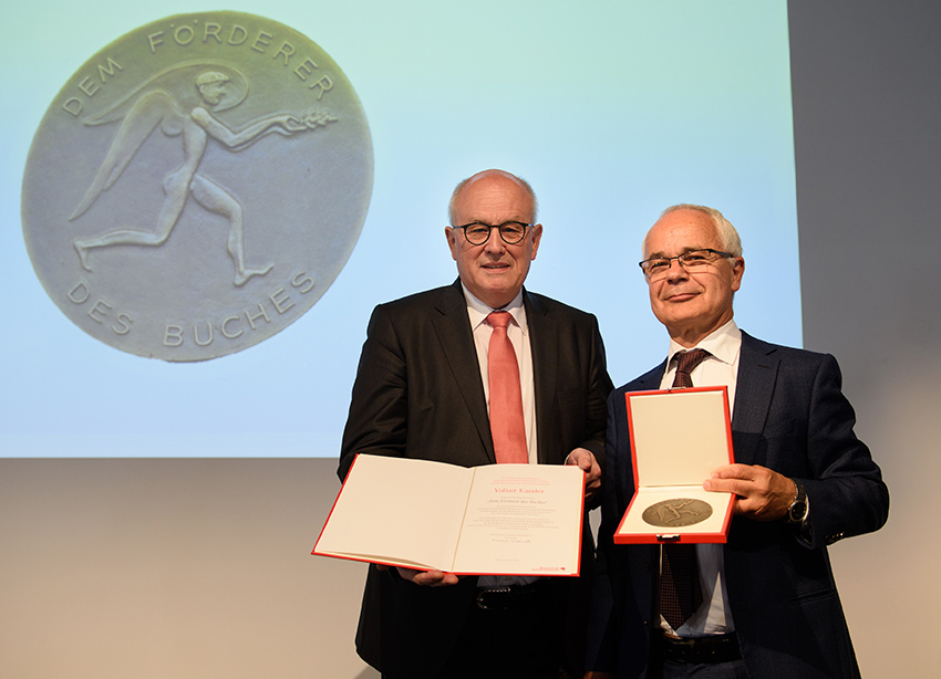 Mit langem Atem setze Kauder sich für faire Rahmenbedingungen rund um das Kulturgut Buch ein – zuletzt auch mit einem erneuten und klaren Bekenntnis zur Buchpreisbindung, ergänzte Vorsteher Heinrich Riethmüller bei der Verleihung der Auszeichnung in Berlin: "Damit hilft er, die Publikationsvielfalt und eine vitale Buchhandelslandschaft zu erhalten."