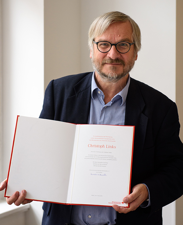 Links sei ein "Verleger durch und durch" – und habe in der DDR selbst erlebt, wie sich Zensur auf eine Gesellschaft auswirke, so Vorsteher Heinrich Riethmüller bei der Ehrung im Rahmen der Hauptversammlung. Sein Verlagsprogramm setze Maßstäbe im gesellschaftspolitischen Diskurs des Landes, im Börsenverein engagiere sich der Berliner Verleger (Verlag Ch. Links) in der Historischen Kommission und als Gründungssprecher der IG Meinungsfreiheit. "Er ist damit nicht nur Vorbild eines engagierten Bürgers und Verlegers – sondern gestaltet seit den frühen 90er Jahren auch den Verband mit," so Riethmüller.