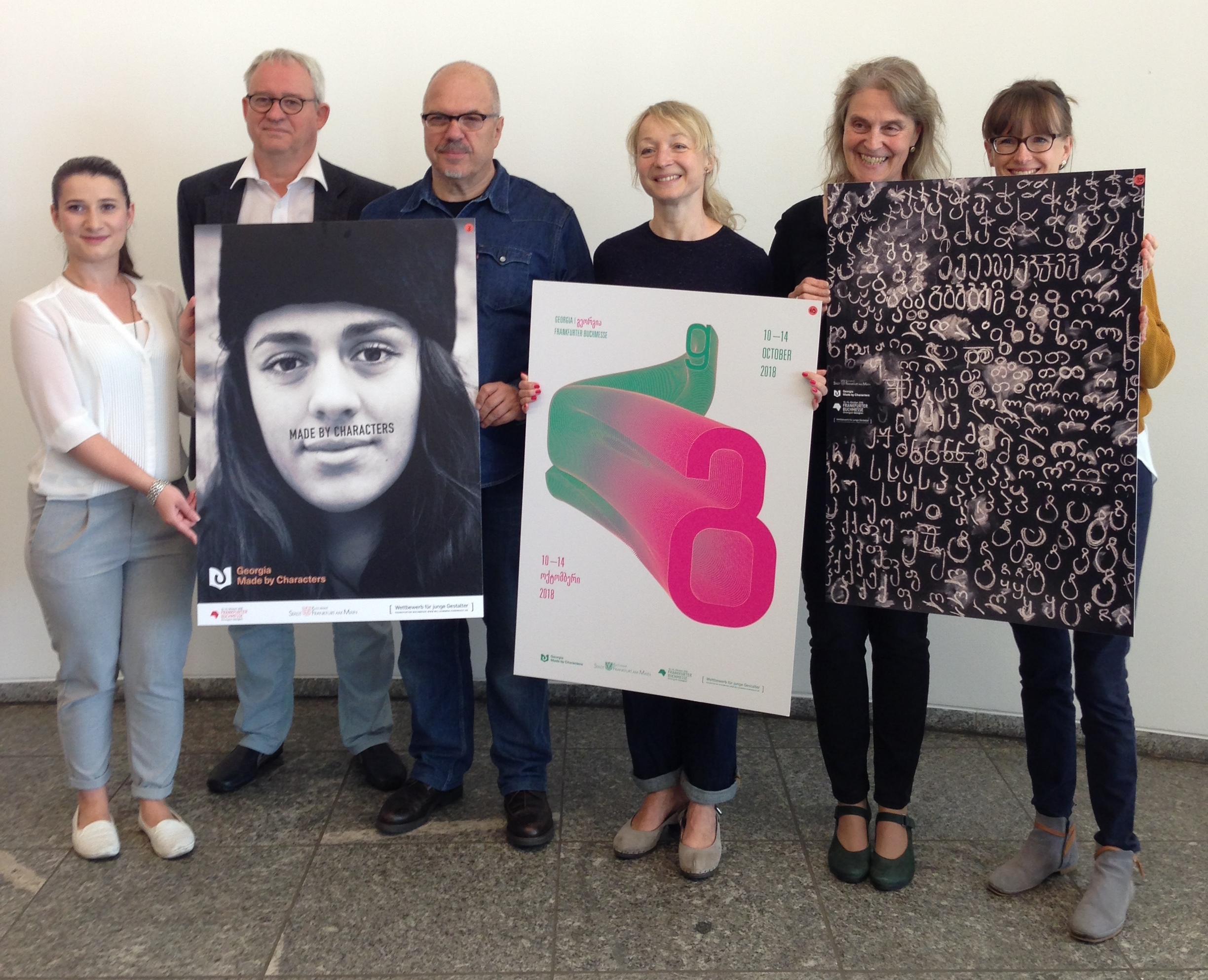 Gewinnerin des Plakatwettbewerbs ist Leonie Schneider von der Technischen Kunstschule in Hamburg. Ihr Plakat zeigt eine schwarz-weiße Großaufnahme einer jungen lächelnden Frau. Blickfänger ist der Schriftzug "Made by Characters", das Motto des diesjährigen Ehrengastes, der wie ein Schnurrbart platziert ist, wie die Frankfurter Buchmesse mitteilt. Das einzigartige georgische Alphabet, das zum UNESCO Weltkulturerbe gehört, steht im Zentrum des Gastlandauftritts Georgiens und so greifen auch die zweit- und drittplatzierten Plakate die georgische Schrift gestalterisch auf: Sarah Gebhard von der Hochschule RheinMain (Wiesbaden) und Caroline Kasper von der Mediadesign Hochschule Berlin.