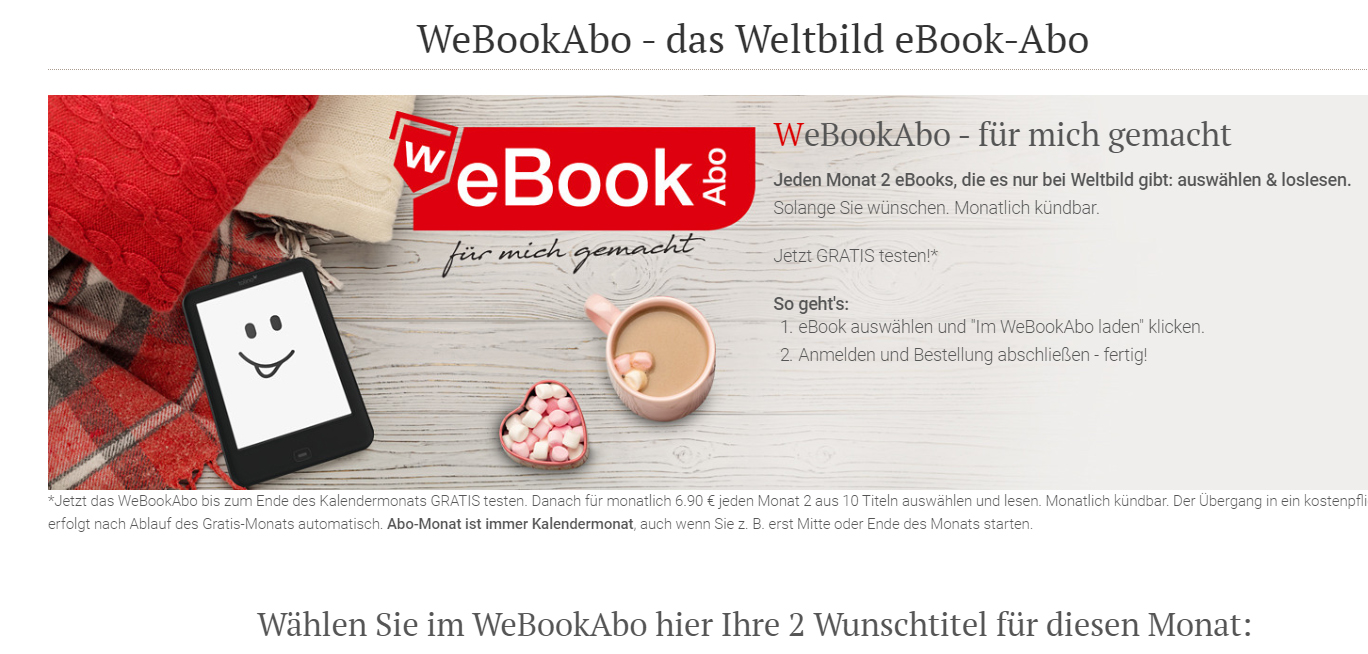 "So wie wir im Katalog unseren Kunden ausgewählte Bücher empfehlen, setzen wir auch beim Abo auf Service und Empfehlung unter dem Motto ‚für mich gemacht'", erklärt Christian Sailer, CEO der Weltbild Gruppe. Dafür wählt die Weltbild-Programmredaktion jeden Monat zehn Titel aus. Im August u.a. dabei: "Clarissa - Im Herzen der Wildnis" von Christopher Ross und "Tödliche Puzzles" von Graeme Hague. Das Abo beinhaltet zwei E-Books im Monat und kostet 6,90 Euro / Monat (ab dem zweiten Monat).
