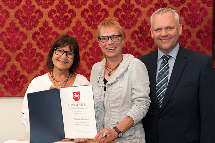 Branka Felba, Vorsitzende des Börsenvereins Landesverband Nord, hielt eine warmherzige Laudatio, die der Buchhändlerin, die zum ersten Mal eine Auszeichnung entgegennehmen durfte („Wir bewerben uns ja sonst nicht“), alle Aufregung nahm. Auch der Bürgermeister der Stadt Buchholz, Jan-Hendrik Röhse, gratulierte – schließlich ist er schon seit seiner eigenen Schulzeit Kunde in der Buchhandlung, die Monika Külper seit 1991 betreibt. Auch am Tag nach der Preisverleihung halten viele Gratulanten die Buchhändlerin vom Tagesgeschäft ab – doch ist diese angenehme Pflicht für Monika Külper „wie eine Woge der Zuneigung“.