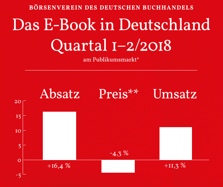 Die enorme Steigerung des Absatzes führte aber dazu, dass der Umsatz trotzdem beträchtlich zunahm: 16,7 Millionen E-Books gingen im ersten und zweiten Quartal 2018 über die digitale Ladentheke − 16,4 Prozent mehr als im Vorjahreszeitraum.