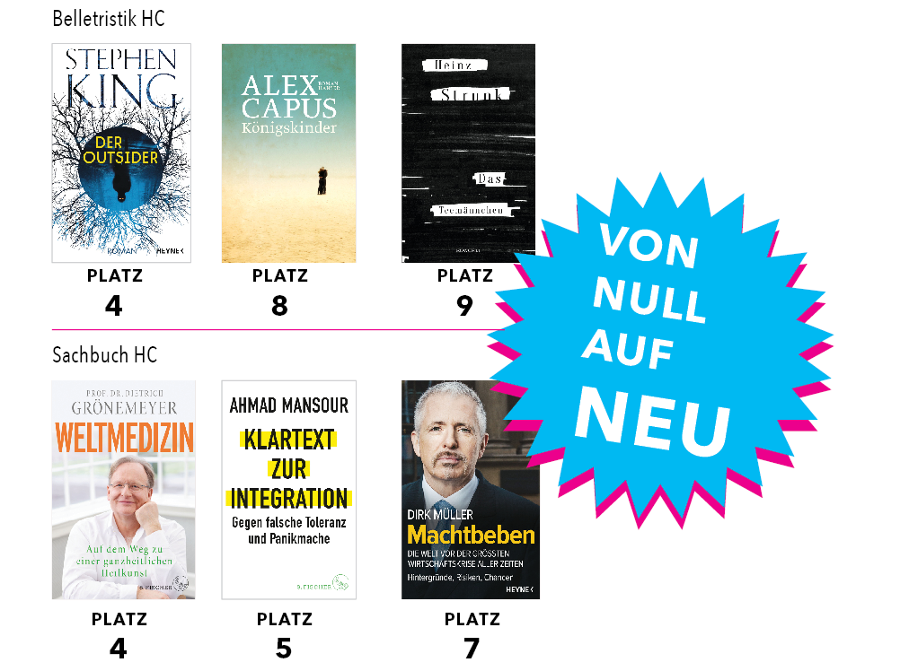 Direkt dahinter allerdings herrscht diesmal ein Kommen und Gehen: Fünf Titel steigen neu in die Top 25 ein – am höchsten Altmeister Stephen King ("Der Outsider", Heyne). Von nichts kommt nichts, so sieht es aus.