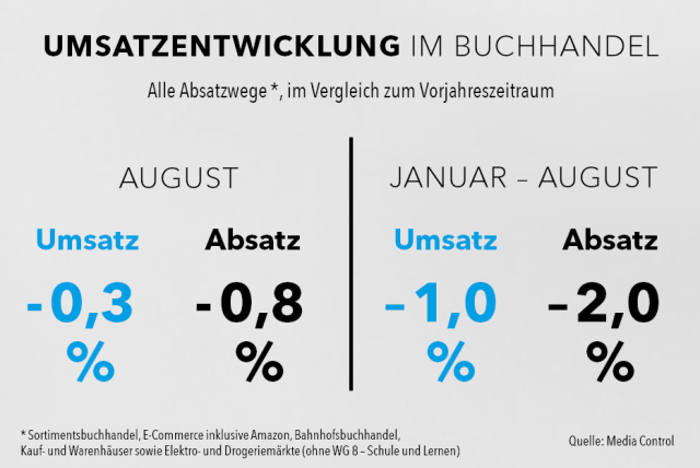 Im August lief es für die Branche zwar wieder etwas besser, rot bleiben die Zahlen dennoch. Über alle Vertriebswege betrachtet, sank der Umsatz laut Branchen-Monitor Buch im Vergleich zum Vorjahresmonat um 0,3 Prozent, der Absatz reduzierte sich um 0,8 Prozent. Kumuliert – für den Zeitraum Januar bis August – , liegt der Buchhandel beim Umsatz jetzt 1,0 Prozent unter dem Vorjahr (Absatz: minus 2,0 Prozent).