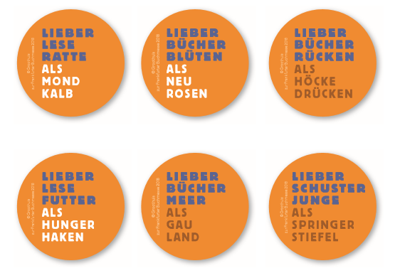 Die Buttons erscheinen anlässlich dieser Frankfurter Buchmesse und sind erhältlich am Stand des Börsenvereins des Deutschen Buchhandels in Halle 3.1/H 85.
