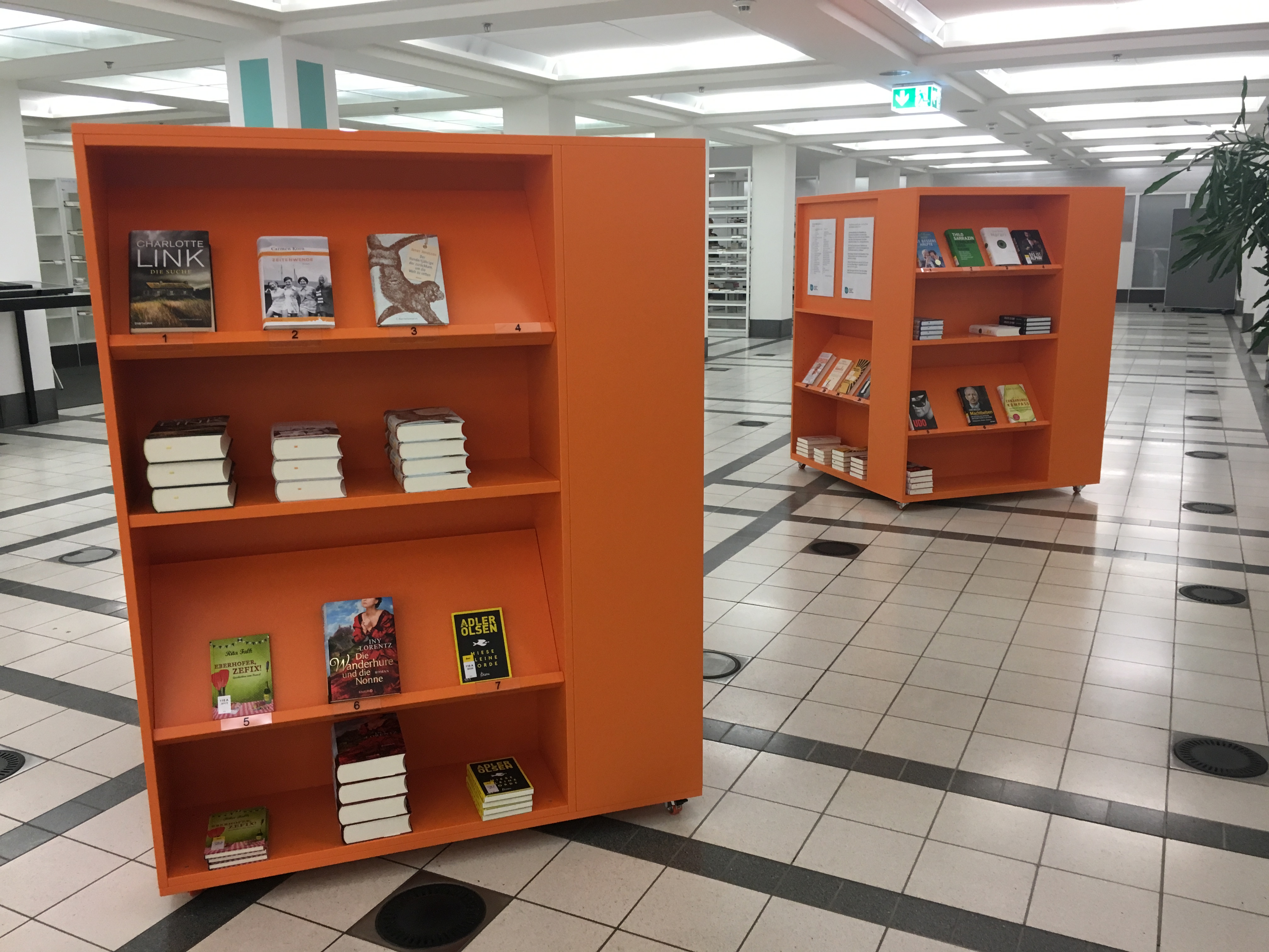 In zwei orangefarbigen, speziell angefertigten Regalen sind an zentraler Stelle im Foyer Romane, Biographien, Kochbücher und vieles mehr zu finden. Die Werke aus den Sparten Belletristik und Sachbuch stehen dabei in Mehrfachexemplaren zur Verfügung, teilt die Badische Landesbibliothek mit. Zudem werde durch wöchentliche Aktualisierungen sichergestellt, dass sich die Literatur stets auf dem Laufenden befindet.