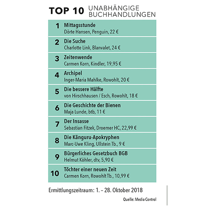 Die Vermutung bewahrheitet sich, dass die unabhängigen Buchhändler mit ihrer Begeisterung erfolgreich ihre eigenen Bestseller machen und ihre Position als unentbehrlicher Handelspartner der Verlage unterstreichen. "Mittagsstunde" von Dörte Hansen (Penguin) ist dafür ein beredtes Beispiel. Das Buch belegte vom 1. bis 28. Oktober den 1. Platz im unabhängigen Sortiment – bei den Filialisten tauchte der Titel gar nicht unter den Top Ten auf. Das zeigt eine Auswertung aus dem Metis Buchpanel, das auch granular nach Absatzwegen filtert, wie Deniz Ulucan, Leitung Buch bei Media Control, betont. "Archipel" (Rowohlt), mit dem Inger-Maria Mahlke dem Deutschen Buchpreis gewonnen hat, fehlt ebenfalls in der Liste der Filialbuchhändler.