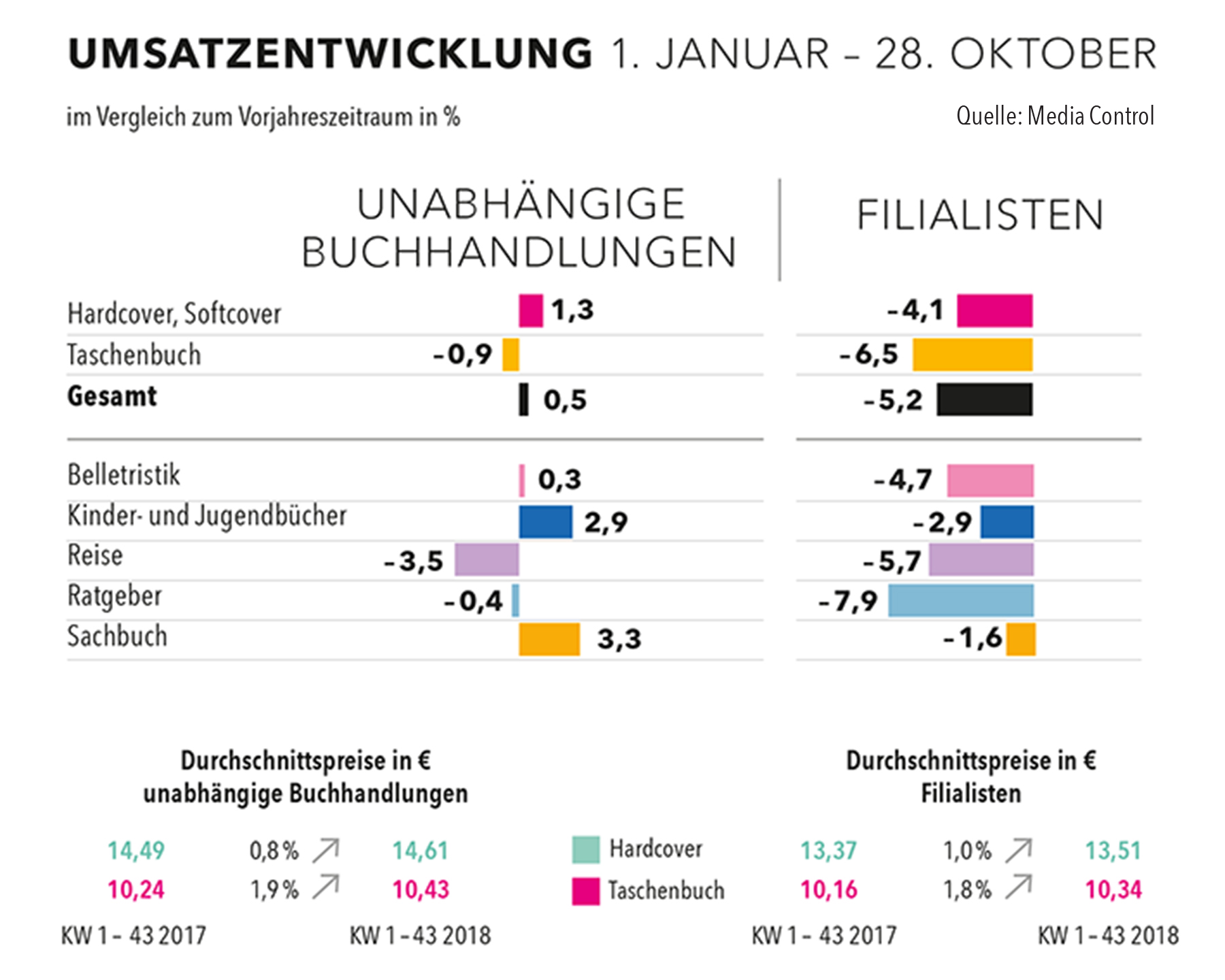 Die Schere der Umsatzentwicklung zwischen den unabhängigen Buchhändlern und den Filialisten klafft vom 1. Januar bis 28. Oktober 2018 weit auseinander. Während die unabhängigen Sortimente in diesem Zeitraum um 0,5 Prozent zugelegt haben, gingen die Einnahmen der Filialisten um 5,2 Prozent zurück – eine Unterschied von 5,7 Prozentpunkten. Die Tendenz pro inhabergeführten Buchhandel gilt laut Deniz Ulucan, Leitung Buch bei Media Control, für den gesamten deutschsprachigen Raum: "In den drei Ländern Deutschland, Österreich und Schweiz zeigt sich der unabhängige Buchhandel stabil."