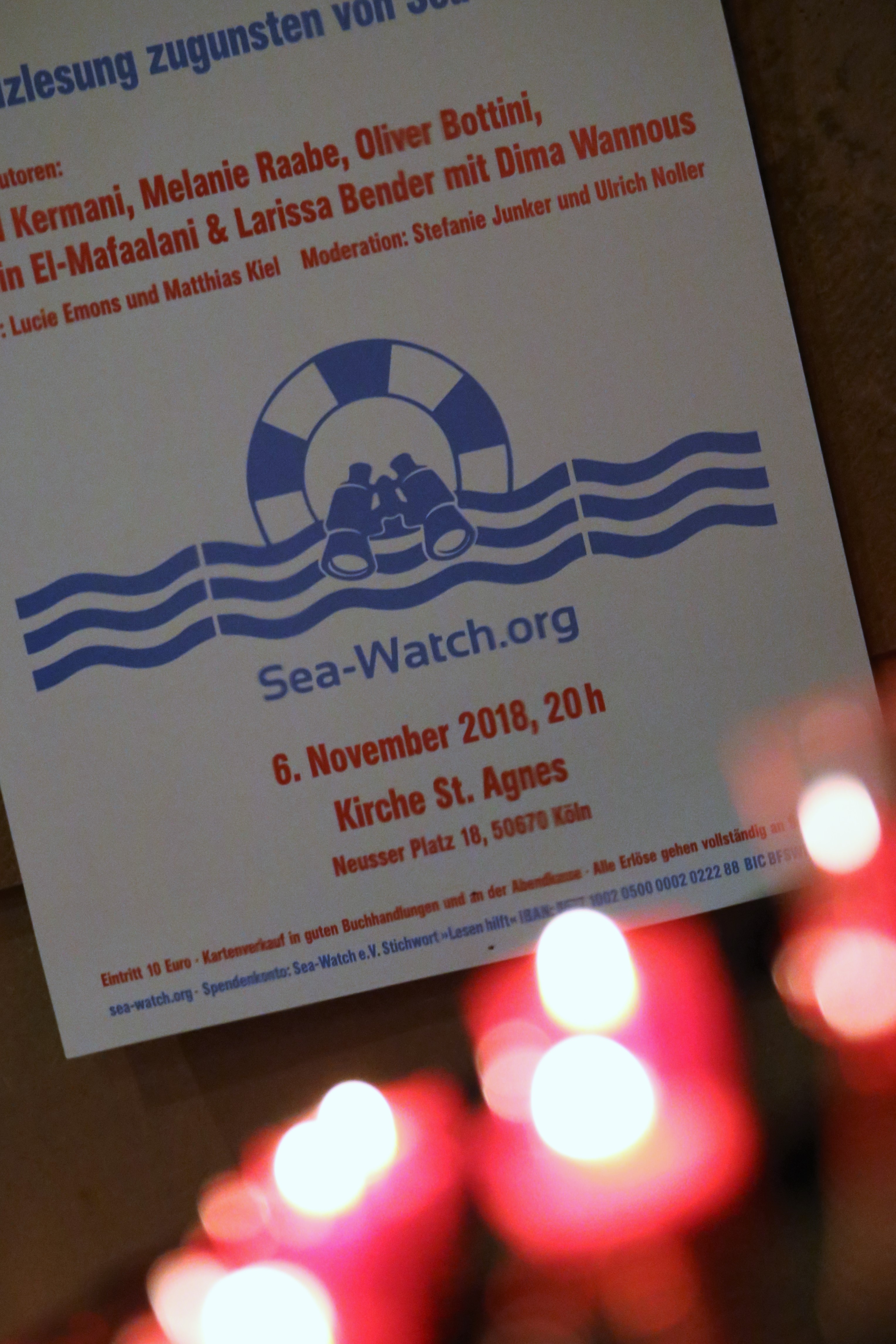 Ausdrücklich danken die Organisatoren auch den Veranstaltungsorten, der Hauptkirche St. Katharinen in Hamburg, St. Agnes in Köln und der Zionskirche in Berlin. Ihr Dank geht auch an die vielen Verlage, die mit Bücherspenden den Verkauf an den Büchertischen unterstützt haben.