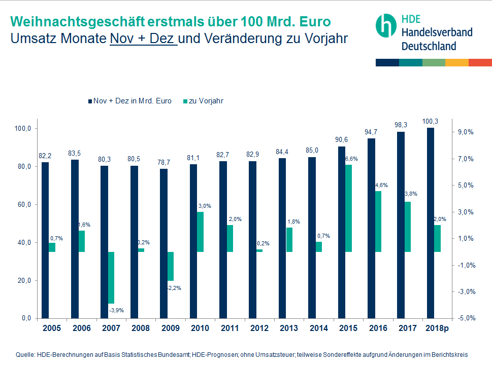 Für das Weihnachtsgeschäft in den Monaten November und Dezember rechnet der HDE mit einem Wachstum von zwei Prozent auf knapp mehr als 100 Milliarden Euro. Damit würde die 100-Milliarden-Schwelle erstmals überschritten werden. Eine aktuellen HDE-Umfrage zufolge gehen die Erwartungen der Unternehmen an den Jahresendspurt allerdings stark auseinander: Kleinere Unternehmen sind danach deutlich pessimistischer als größere.