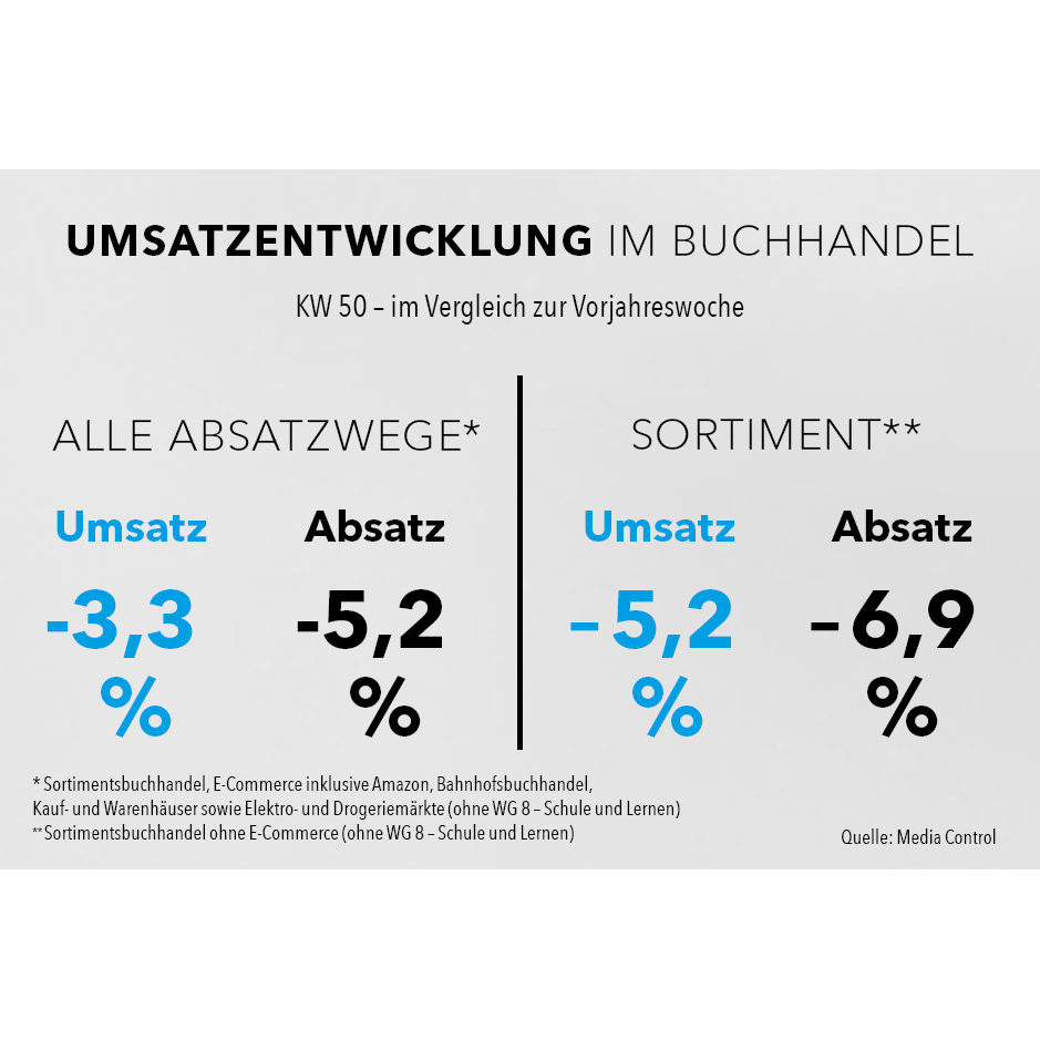 Betrachtet man nur die ersten beiden Adventswochen (KW 49 und KW 50) kumuliert, entsteht eine Lücke von minus 0,9 Prozent über alle Vertriebswege hinweg (Sortimentsbuchhandel ohne E-Commerce: -3,2 Prozent).