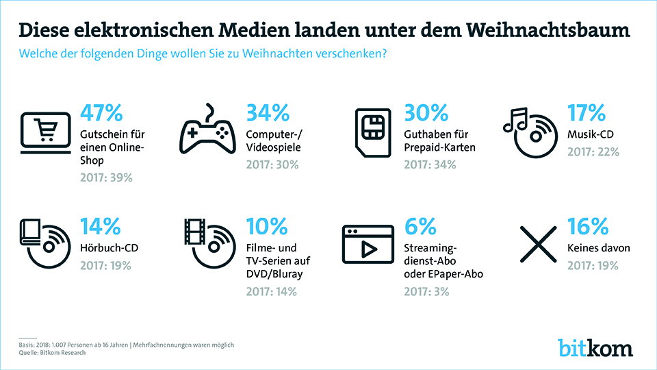 Das beliebteste digitale Präsent sind demnach Gutscheine für Online-Shops, die beinahe jeder Zweite (45 Prozent, 2017: 39 Prozent) zum Fest verschenken will. Auf dem zweiten Platz landeten bei der Umfrage Computer- und Videospiele (34 Prozent, 2017: 30 Prozent). Auch Abonnements für Streaming-Dienste oder E-Paper werden beliebter: Vor einem Jahr griffen noch drei Prozent zu diesem Geschenk, 2018 hat sich die Zahl bereits auf 6 Prozent verdoppelt.