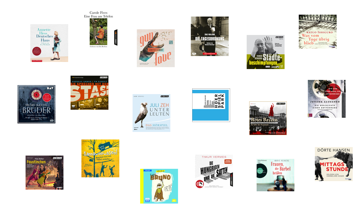 Die Nominierungsjury votierte für Walter Adlers Hörspielfassung von Hilary Mantels Historienroman "Brüder" (Der Audio Verlag / WDR), für die dokumentarische Originaltoncollage "Sie sprechen mit der Stasi" (der Hörverlag / WDR) von Andreas Ammer und FM Einheit sowie für Judith Lorentz‘ Hörspieladaption von Juli Zehs Erfolgsroman "Unterleuten" (der Hörverlag / rbb, NDR).