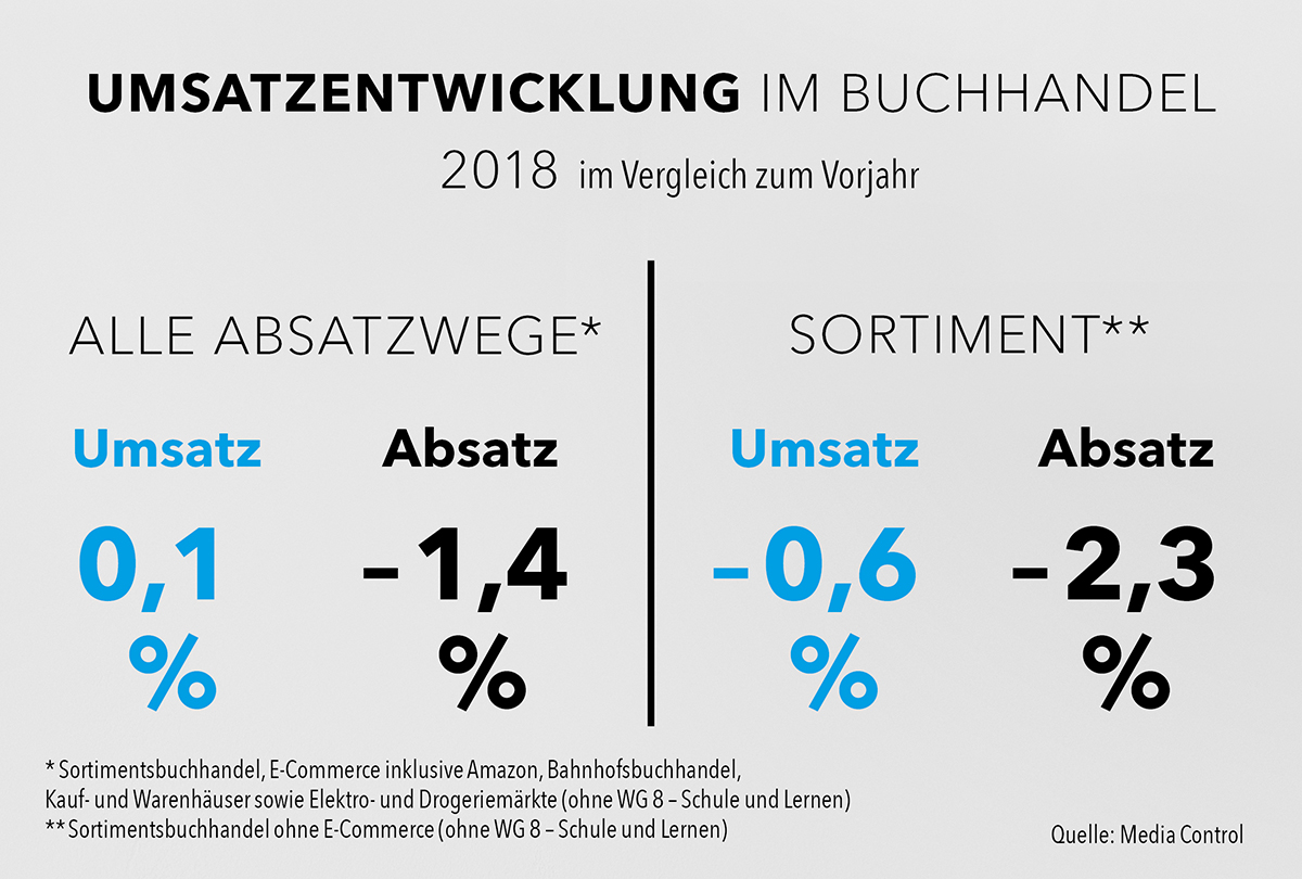 Für Rückenwind über alle Vertriebswege hinweg sorgte das steigende Niveau der verkauften Bücher. Der Durchschnittspreis lag im vergangenen Jahr bei 13,36 Euro – das sind 1,4 Prozent mehr als 2017. Damit konnte der Absatzrückgang von 1,4 Prozent gerade so kompensiert werden.