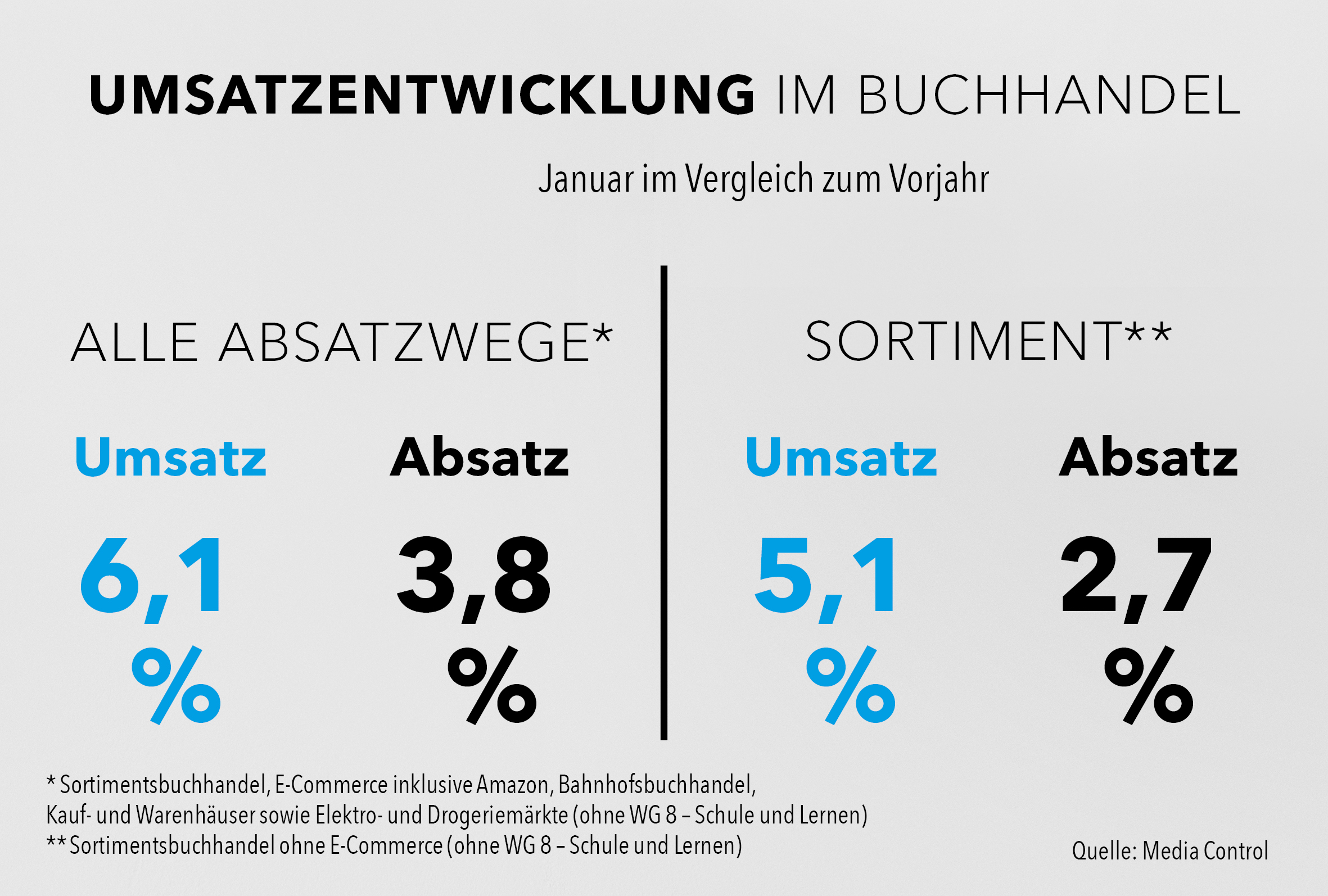 Hard- und Softcover überstiegen ihren Vorjahreswert im Januar um 5,8 Prozent, der Durchschnittspreis lag im Sortiment bei 15,42 Euro. Der Taschenbuchumsatz kletterte um 2,5 Prozent, pro Titel wurden im Schnitt 10,57 Euro fällig. Gewinner des Monats ist auch im Sortiment das Sachbuch – mit einem Plus von 17,9 Prozent (Durchschnittspreis: 16,68 Euro). Für die Belletristik ging es um 5,4 Prozent nach oben, bei einem Preis von 12,61 Euro. Ins Minus rutschten im Januar nur die Warengruppen Naturwissenschaften, Medizin, Informatik, Technik sowie Sozialwissenschaften, Recht, Wirtschaft. Bei der Absatzentwicklung konnten die Sortimenter – nach dem Dezember-Minus – wieder aufatmen. Die Zahl der verkauften Bücher nahm um 2,7 Prozent zu. Der Durchschnittspreis bewegte sich bei 13,47 Euro – und damit um 2,4 Prozent über dem Vorjahreslevel.