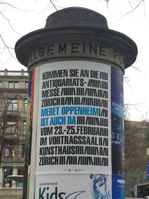 Das Plakat "Meret Oppenheim ist auch da", mit dem die Antiquariats-Messe Zürich 2018 in der Stadt auf sich aufmerksam gemacht hat, ist beim Swiss Poster Award 2019 in der Kategorie Kultur mit Bronze ausgezeichnet worden. In der Laudatio heißt es: "Die Antiquariats-Messe Zürich wurde auf Plakaten mit visuell minimalistischen Bücherregalen und gradliniger Helvetica Typografie beworben. Darauf wird mit einem Augenzwinkern behauptet, eine Reihe berühmter Persönlichkeiten seien auch an der Messe anzutreffen. Natürlich nicht persönlich, aber dafür im Geiste – vertreten durch ihre Bücher."