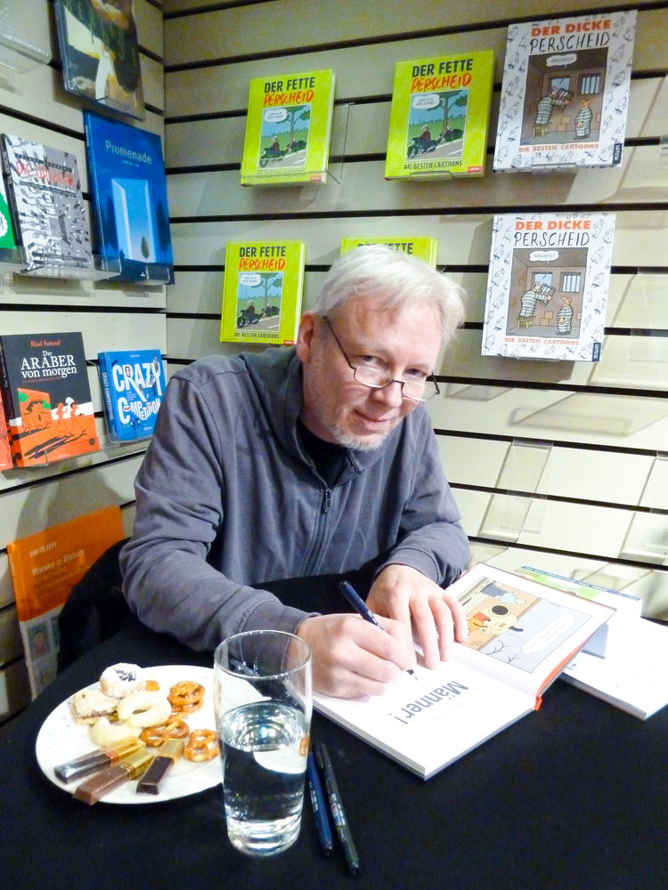 Martin Perscheid ist beschäftigt, sehr beschäftigt. Die Zahl an Cartoons, die der Zeichner seit seiner Jugend gezeichnet hat, geht in die Tausende. Auf seiner Website sind sie akribisch durchnummeriert und mit dem Vermerk versehen, in welchem der zahlreichen Bücher sie erschienen sind (alle bei Lappan). Deshalb ist der Zeichner immer wieder in Buchhandlungen zu Gast und signiert Ausgaben – die Fangemeinde steht Schlange. Neben dem Publikumserfolg, den die zahlreichen Likes und Kommentare in interaktiven Medien bezeugen, ist auch die Wertschätzung professioneller Cartoonkenner verbrieft: 2002 erhielt Perscheid den Max und Moritz-Preis und belegte 2004 den dritten Platz beim Deutschen Karikaturenpreis.