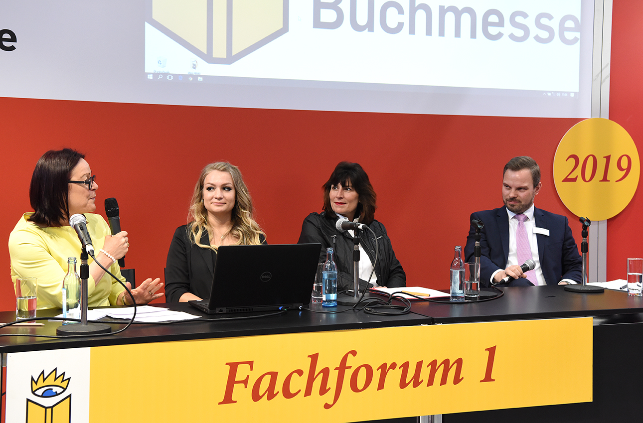 Sarah Backfisch von Thalia in Bremerhaven, die Vertriebsberaterin Stephanie Lange und Daniel Rieger, Leiter B-to-B, Ausland und Lizenzen bei der Westermann Gruppe diskutierten unter dem Motto "Künstliche Intelligenz steuert Bücherregale" mit Monika Kolb, Geschäftsführerin des mediacampus in Frankfurt am Main, über künftige Arbeitsbedingungen und berufliche Anforderungen von Buchhändlern.