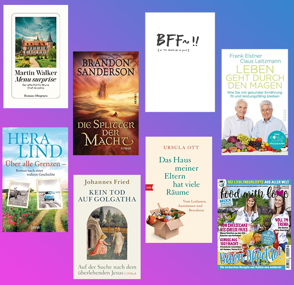 Vier Titel erleben in der Top 25 (Hardcover) diesmal ihre Premiere, jeder setzt seinen Schwerpunkt aber etwas anders. In der Reihenfolge des Rankings: Frank Elstner und Claus Leitzmann widmen sich in "Leben geht durch den Magen" (Piper; Platz 14) der gesunden Ernährung, Hera Lind verarbeitet in "Über alle Grenzen" (Diana; Platz 17) Biografisches – während Johannes Fried in "Kein Tod auf Golgatha" (C.H.Beck; Platz 23) beweisen will, dass Jesus seine Kreuzigung einst überlebte. Ursula Ott wiederum geht es ums Reflektieren und Loslassen: In "Das Haus meiner Eltern hat viele Räume" (btb; Platz 24) beschreibt sie, wie das ist – wenn älter gewordene Kinder den Haushalt ihrer alternden Eltern auflösen (müssen).