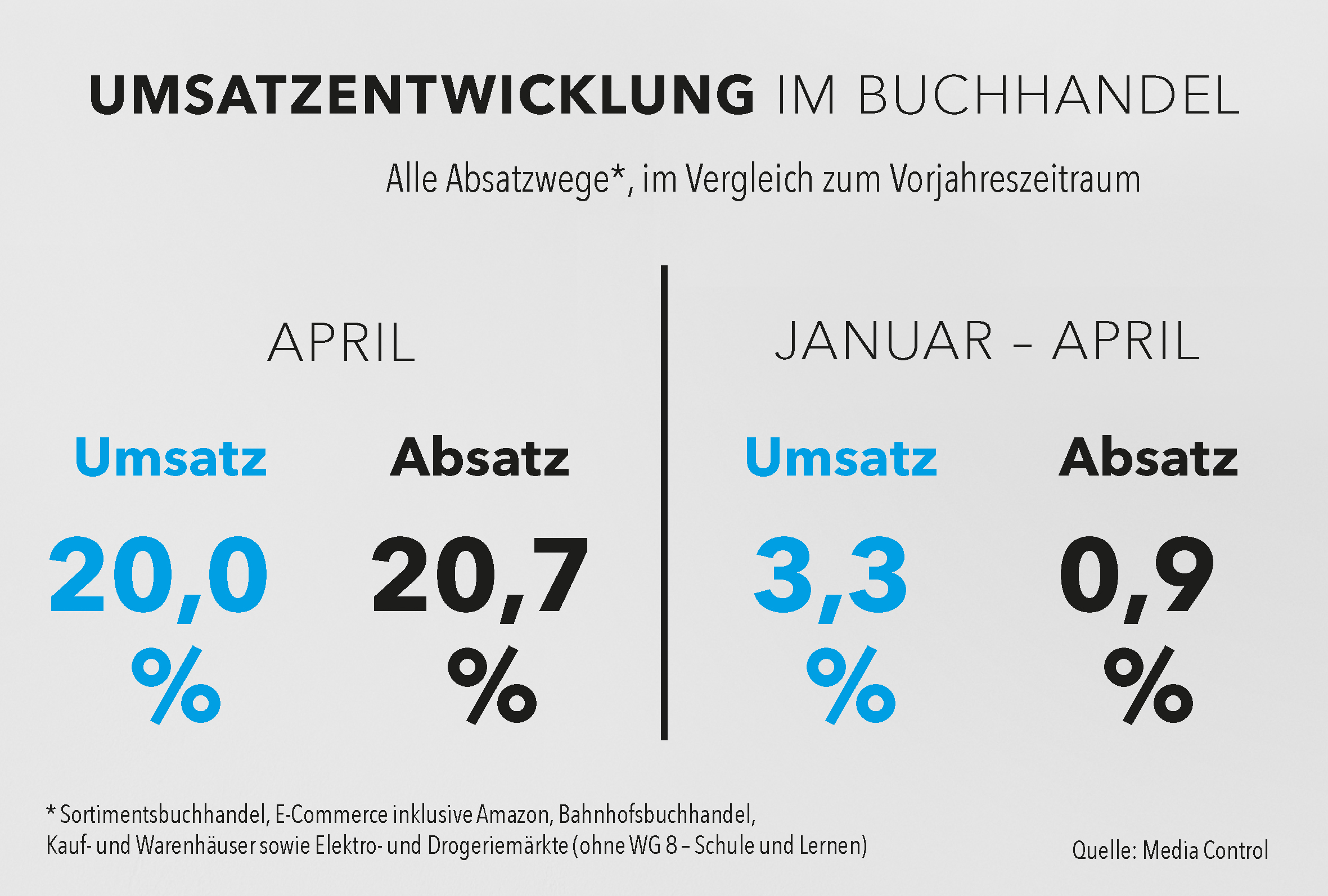 Auch der Absatz kletterte für den Buchhandel im April zweistellig nach oben (plus 20,7 Prozent), so ein weiteres Ergebnis des Branchen-Monitor Buch, den Media Control im Auftrag des Börsenvereins ermittelt. Damit ergibt sich für den Buchhandel über alle Absatzwege auch für Januar bis April kumuliert ein Umsatzplus von 3,3 Prozent gegenüber der Vorjahresperiode.