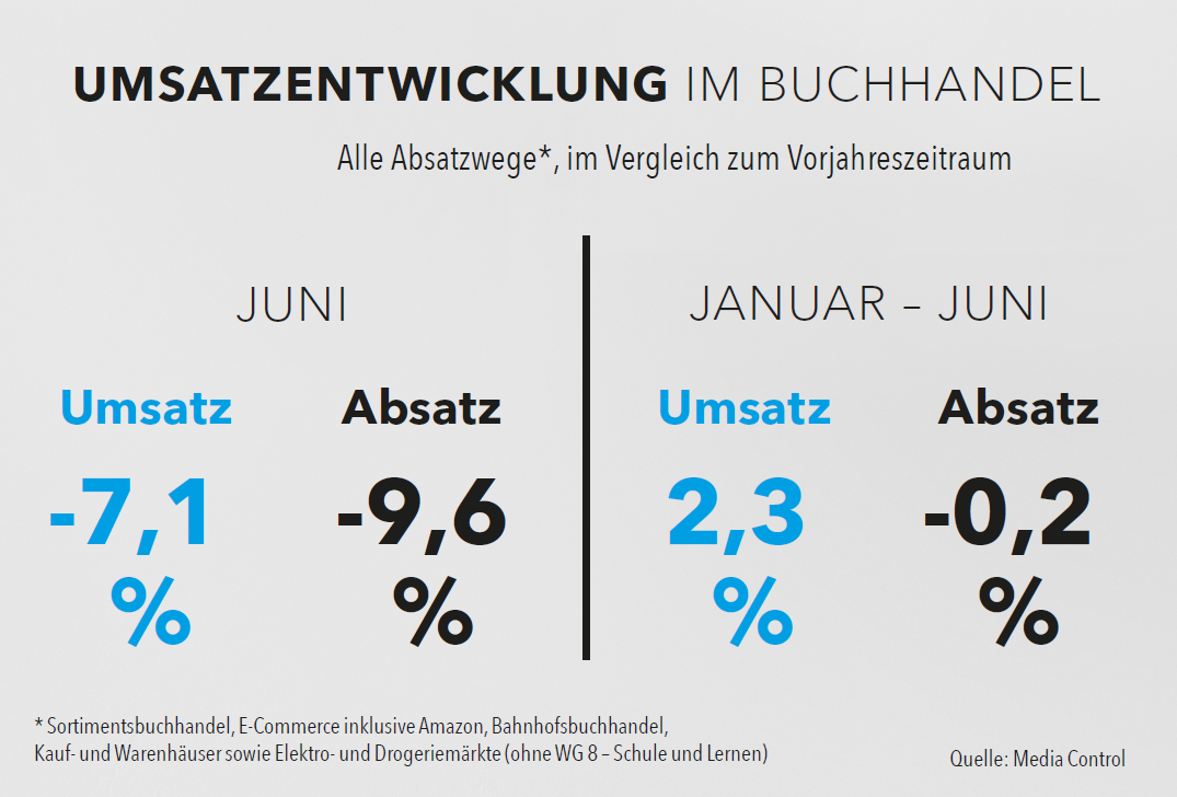 Überall wurde in den letzten Wochen über die hohen Temperaturen gestöhnt. Dass äußere Bedingungen wie diese nicht zu einem Besuch in der Buchhandlung einladen, zeigt sich am Juni-Ergebnis (zwei Verkaufstage weniger) im Branchen-Monitor Buch von Media Control. Demnach gingen die Einnahmen über alle Vertriebswege um 7,1 Prozent zurück. Schwach präsentierten sich gerade die sonst starken Warengruppen Belletristik und Kinder- und Jugendbuch, die beide knapp acht Prozent unter Vorjahr lagen. Einziger Gewinner: das Sachbuch mit einem Zuwachs von 2,5 Prozent. Bei den Editionsformen mussten Hard- und Softcover ebenfalls Umsatz abgeben und blieben mit 7,7 Prozent hinter ihren Vorjahreswerten zurück, die Taschenbücher mit 4,2 Prozent.