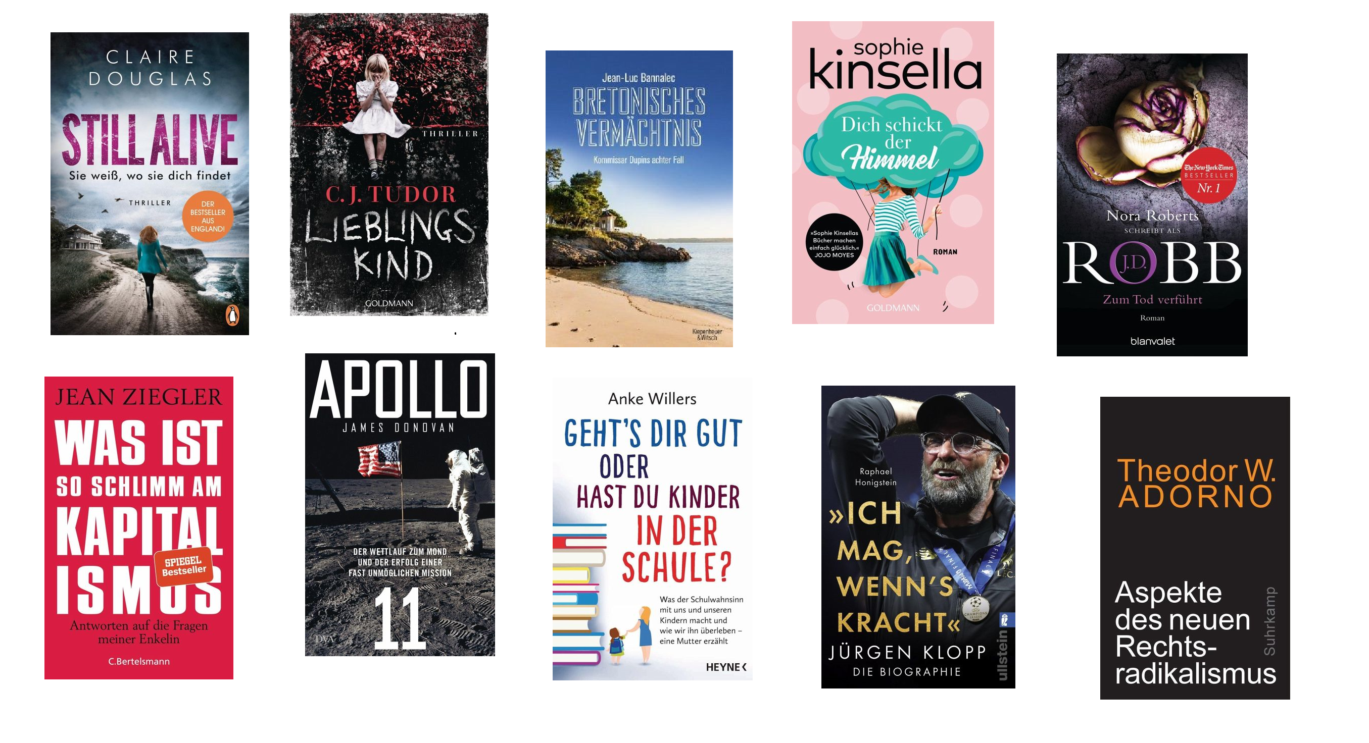 Auf der Eins und Zwei bleiben Jean-Luc Bannalec ("Bretonisches Vermächtnis"; Kiepenheuer & Witsch) und Mona Kasten ("Hope Again", Lyx), dahinter werden einige Plätze getauscht. Zwei Neulinge gilt es zu begrüßen: Auf Platz 9 die frühere Journalistin Claire Douglas mit "Still Alive − Sie weiß, wo sie dich findet" (Penguin). Der Inhalt: Libby und ihr Mann kommen per Haustausch nach Cornwall, suchen eine Auszeit − aber Libby fühlt sich beobachtet. Was steckt dahinter? Und auf der 25 schafft es die britische Autorin C.J. Tudor mit dem Thriller "Lieblingskind" (Goldmann) neu in die Charts. Nach 24 Jahren taucht die über Nacht verschwundene Annie wieder bei ihrem Bruder auf − verändert und angsteinflößend, verheißt der Verlag.