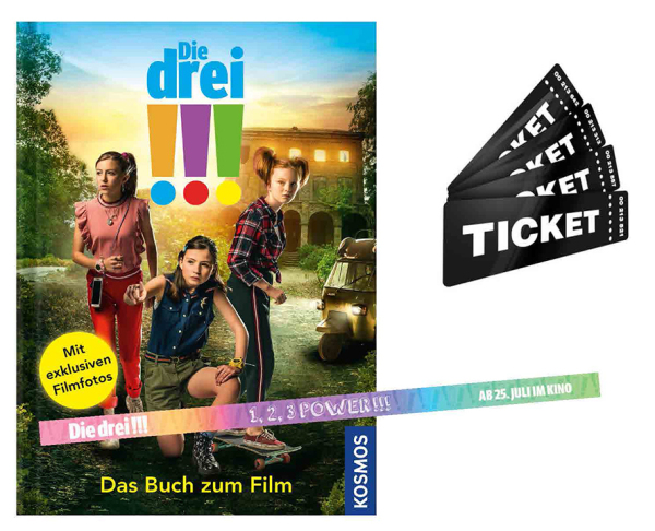 Eins von zwei Fanpaketen zu "Die Drei Ausrufezeichen". Enthalten sind jeweils zwei Freikarten, das Buch zum Film (Kosmos Verlag), ein Badetuch und drei Freundschaftsarmbänder. "Die drei Ausrufezeichen" stürmen nach 80 Buch- und Hörspielabenteuern ab 25. Juli die Kinoleinwand für ein spannendes Detektivabenteuer. Die Nachwuchs-Detektivinnen Franzi (Alexandra Petzschmann), Kim (Lilli Lacher) und Marie (Paula Renzler) nehmen in den Ferien an einem Theaterprojekt zu "Peter Pan" teil. Aber irgendjemand versucht die Proben mit dem schrulligen Regisseur Robert Wilhelms (Jürgen Vogel) zu sabotieren. Oder spukt es tatsächlich im alten Theater? Ganz klar ein Fall für Die drei Ausrufezeichen!