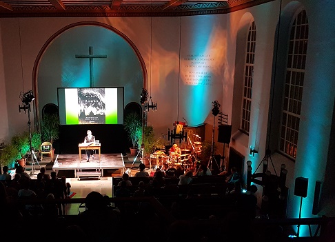 Akram El-Bahay bekam vor zwei Jahren während des 13. Fantasy-Festivals – ebenfalls in einer schwülen Gewitternacht – die Idee, den Klimawandel zum Thema zu machen. Jetzt stellte er in einer fesselnden Lesung seinen Roman „Herzenmacher“ vor, in dem ewiger Winter eine Welt gefangen hält. Auch Karl Olsberg war wiederholt zu Gast, diesmal mit „Boy in a Dead End“. Kann man die Essenz eines Menschen, seine Erfahrungen, Gefühle, Erinnerungen, auf eine Maschine übertragen?? Wird der Traum vom ewigen Leben wahr? Spannend, nachdenklich las er.