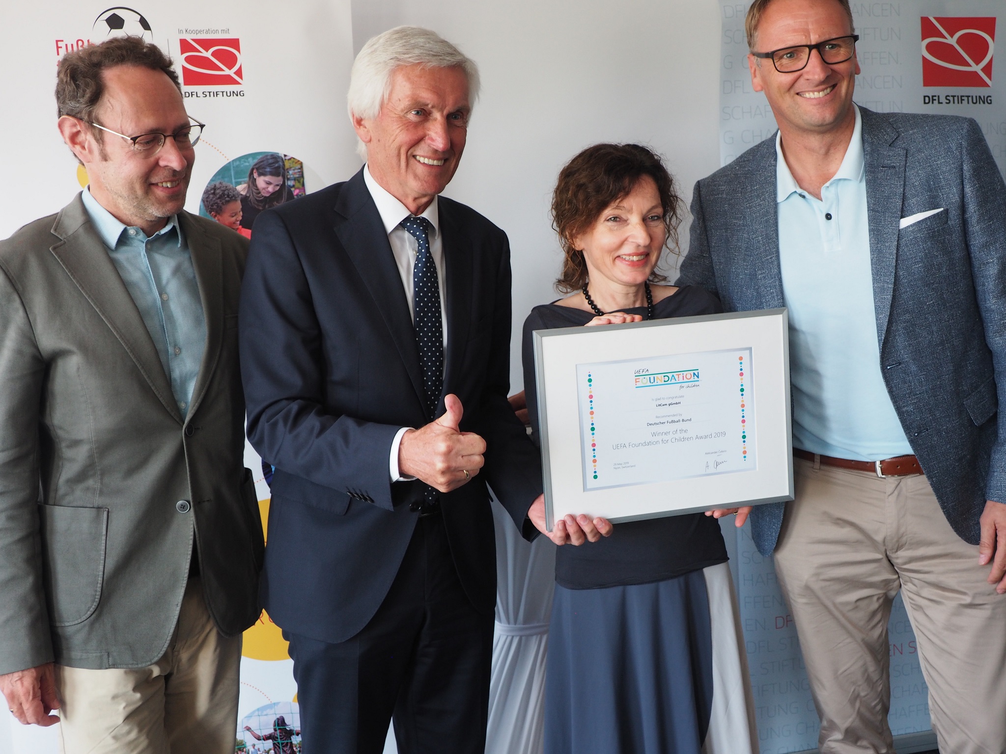 Eugen Gehlenborg, DFB-Vizepräsident für Sozial- und Gesellschaftspolitik, überreichte den Preis im Auftrag der UEFA in Gegenwart von Stefan Kiefer, Vorstandsvorsitzender der DFL Stiftung, und Olliver Tietz, Geschäftsführer der DFB-Kulturstiftung.