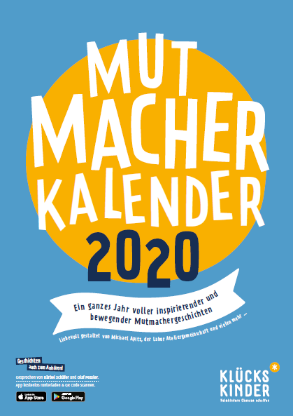 Mit dem Angebot des Mutmacher-Kalenders will der Verein Klückskinder Heim und Pflegekindern Mut machen, ihren Weg mit allen Höhen und Tiefen zu gehen. In KW 40 erscheint der Kalender mittlerweile in der sechsten Ausgabe – zum ersten Mal kann der Buchhandel den Kalender dann über die Barsortimente beziehen.