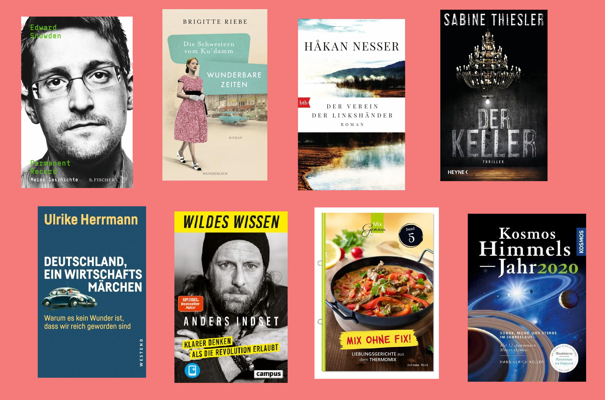Das Spitzenquintett bilden wie gewohnt der unverwüstliche John Strelecky (4x) und Stefanie Stahl (1x), aber gleich dahinter, auf Platz 6, reiht sich einer der drei Neulinge ein: Corinna Wild mit "Mix ohne Fix!" (C.T. Wild Verlag). Das Rezeptheft (48 S.) stellt Lieblingsgerichte aus dem Thermomix zusammen. Für Sternenfreunde steht "Kosmos Himmelsjahr 2020" (Kosmos) von Hans-Ulrich Keller bereit. Keller, unter anderem Professor für Astronomie an der Universität Stuttgart, gibt das "Kosmos Himmelsjahr" seit über 30 Jahren heraus − die Ausgabe 2020 des Klassikers steigt neu auf Platz 9 in die Charts ein. Dritter Neueinsteiger ist auf Rang 14 der Arzt Rangan Chatterjee, bekannt durch die BBC-Erfolgsserie "Doctor in the House": In "Der 4-Säulen-Plan. Relax, Eat, Move, Sleep" (Goldmann) erklärt er, wie man innerhalb der vier Säulen mit einfachen Schritten ein gesundes Leben erreichen kann. Sein Buch ist der Top-Aufsteiger in den Ratgeber-Charts, kletterte um 57 Plätze nach oben.