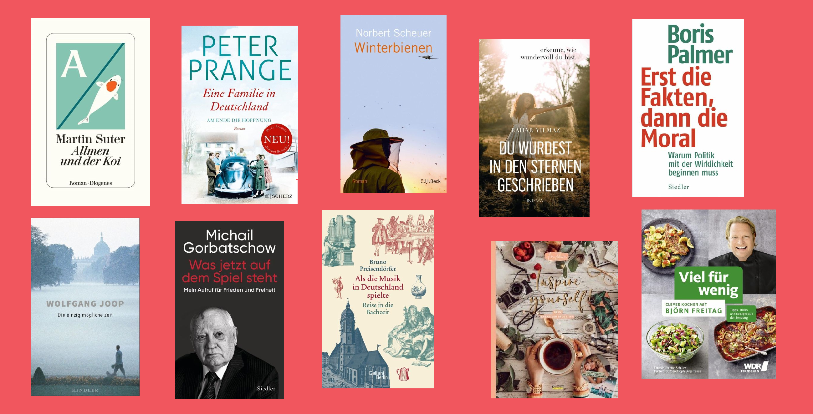 Die restlichen drei Neueinsteiger: Designer Wolfgang Joop schildert in "Die einzig mögliche Zeit" (Kindler; Platz 15) seine Jugendjahre auf dem Bauernhof seiner Großeltern, und der ehemalige sowjetische Staatspräsident Michail Gorbatschow sorgt sich in "Was jetzt auf dem Spiel steht" (Siedler; Platz 18) um die "gefährliche Unordnung der Welt", liefert einen "Aufruf für Frieden und Freiheit", so der Untertitel.