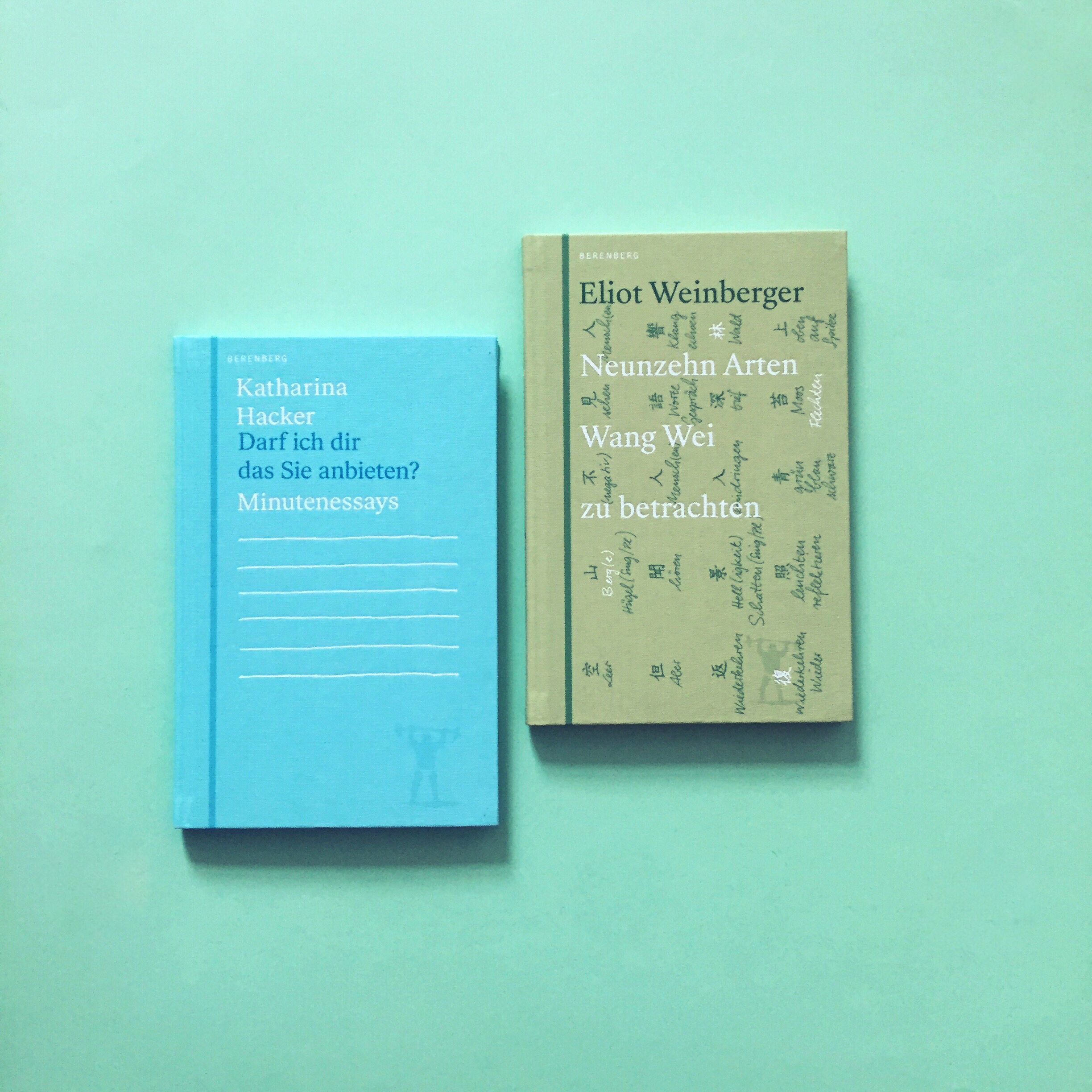 „Seit fünfzehn Jahren machen wir Bücher, die sich herum gesprochen haben: Sie sind fadengeheftet, der Umschlag hat auf der linken Seite, dort, wo er an das schwarze Halbleinen stößt, mit dem die Bücher gebunden sind, einen Streifen in wechselnden Pastellfarben, dessen Farbe sich auf dem Vorsatzblatt im Inneren wiederholt. So sehen die Berenberg-Bücher aus, und wir werden sie nicht verändern. Trotzdem kann man ihnen, nach fünfzehn Jahren, doch mal was Neues an die Seite stellen“, so Heinrich von Berenberg, „Die Autoren der ersten beiden Bände sind, auch das war uns wichtig, keine Unbekannten: Katharina Hacker hat mit diesen Texten ein Neuland im Märchenland zwischen Alltag und Philosophie beschritten. Und Eliot Weinberger betrachtet mit entspannt kritischem Blick, was beim Lesen und Übersetzen von vier alten chinesischen Gedichtzeilen heraus gekommen ist.“