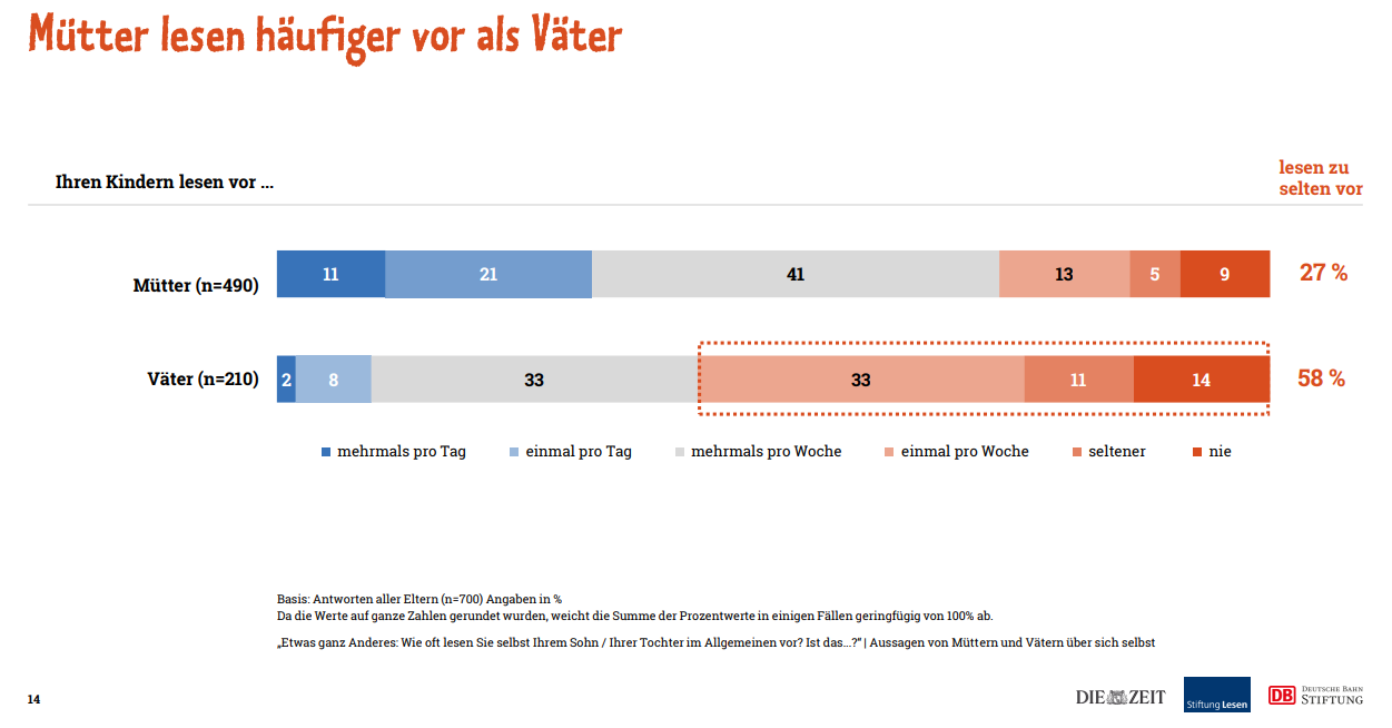 Weiter hat die Vorlesestudie herausgefunden, dass berufstätige Mütter mehr vorlesen als nicht berufstätige. Sie hätten zwar stärker begrenzte Zeiten mit ihrer Familie bzw. ihren Kindern, nutzten diese Zeiten aber gezielter und intensiver. Zudem hätten sie tendenziell häufig eine höhere Bildung, "und höher Gebildete lesen überduchschnittlich häufig vor", so die Studie. Im Vergleich lesen 27 Prozent berufstätiger Mütter zu selten vor, bei den nicht berufstätigen sind es 39 Prozent. Väter sind weiterhin Vorlesemuffel, 58 Prozent von ihnen lesen selten oder nie vor.