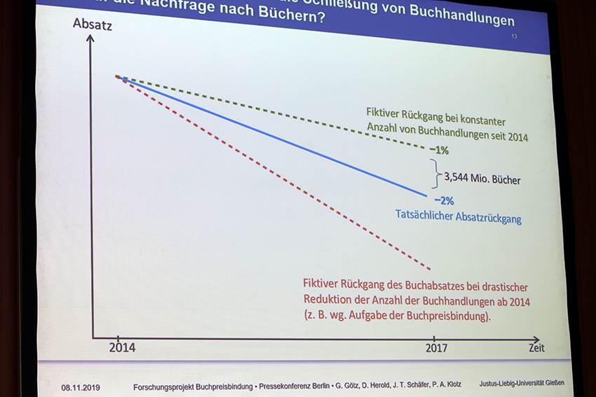 Schließt in Deutschland eine Buchhandlung, werden dadurch jährlich im Schnitt etwa 6.100 Bücher weniger abgesetzt. Es kommt somit nur teilweise zu einer Abwanderung der Käuferinnen und Käufer in den Online-Handel und zu E-Books. Insgesamt sind durch den Wegfall von Buchhandlungen bundesweit von 2014 bis 2017 rund 3,5 Millionen Bücher weniger verkauft worden – das entspricht rund 56 Prozent des gesamten Absatzrückgangs. Der Absatzrückgang von Büchern in Deutschland hat sich zwischen 2014 und 2017 durch den Effekt der Schließung von Buchhandlungen verdoppelt (2 Prozent statt hypothetisch bei gleichbleibender Anzahl an Buchhandlungen 1 Prozent).