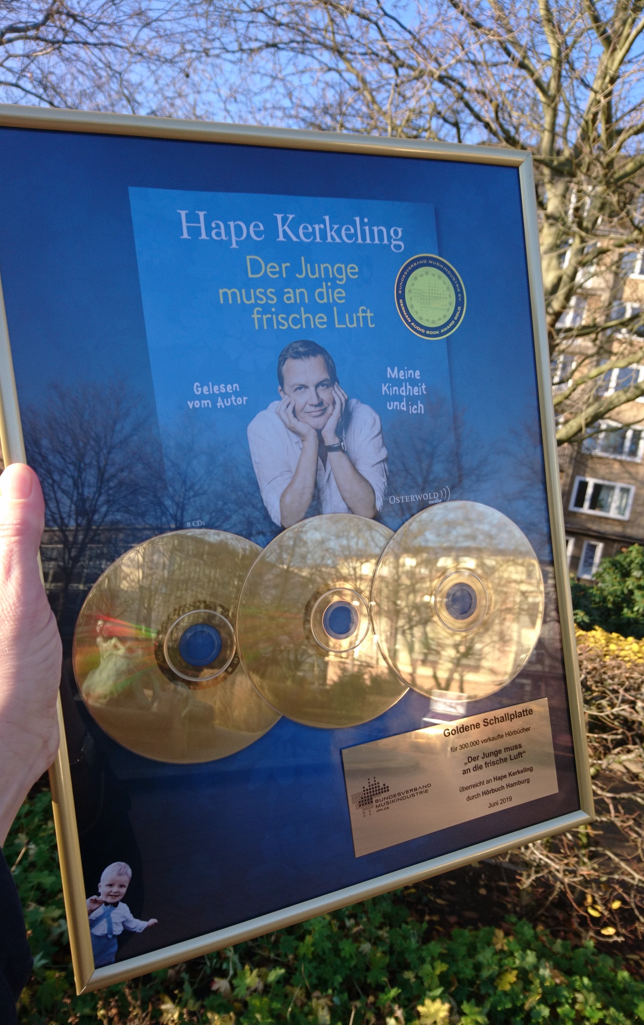 Als Sechsjähriger musste er der Oma versprechen, eines Tages berühmt zu werden. Das Versprechen hat Hape Kerkeling gehalten. Wie und auf welchen Wegen und Umwegen ihm dies gelang, erzählt Hape Kerkeling in seinen Memoiren "Der Junge muss an die frische Luft" (2014). Das Hörbuch, von ihm selbst gelesen und nach nur wenigen Wochen mit der Goldenen Schallplatte ausgezeichnet, hat nun den Goldstatus mit weit über 300.000 verkauften CDs und Downloads in diesem Jahr verdreifacht.