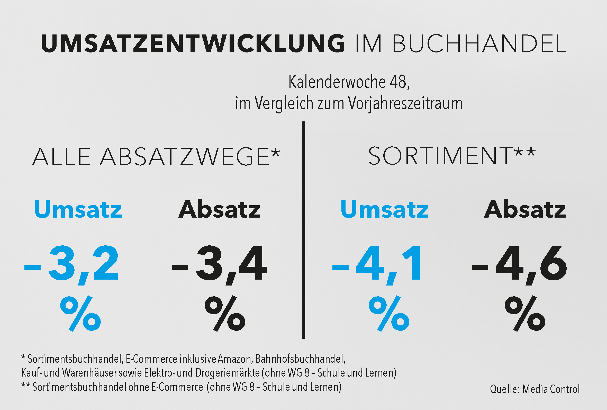 Es geht wieder los: In den kommenden Wochen analysiert das Börsenblatt in Zusammenarbeit mit den Marktforschern von Media Control detailliert das Weihnachtsgeschäft. Wir liefern Ihnen jede Woche Zahlen über die Entwicklung der Vorwoche sowie kumulierte Werte. Den Auftakt macht die Kalenderwoche 48 mit einem recht untertourigen Start. Demnach blieben die Umsätze über alle Vertriebswege hinweg um 3,2 Prozent hinter der Vergleichswoche des Vorjahrs zurück. Trotzdem kann der Buchhandel den gesamten Monat November immer noch mit einem Plus von 1,5 Prozent abschließen.