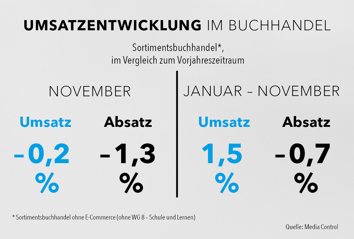 Für den Sortimentsbuchhandel ergibt sich kumuliert von Januar bis November gegenüber dem Vorjahr ein Umsatzplus von 1,5 Prozent, der Absatz war im gleichen Zeitraum mit minus 0,7 Prozent leicht rückläufig.