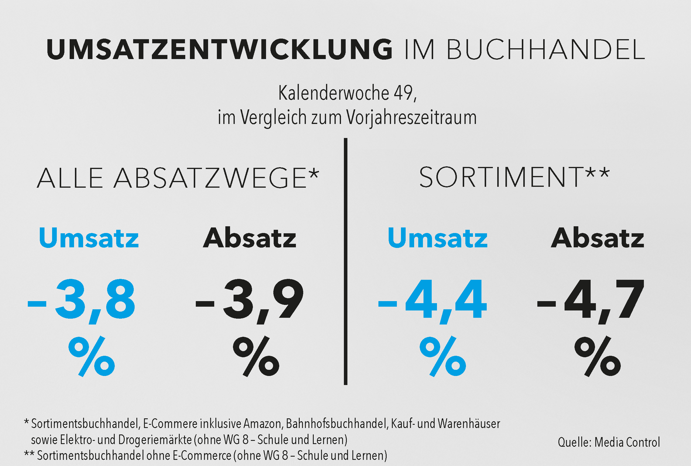 Die Vorlage war gut, der Buchhandel ist mit kräftigem Rückenwind in die heiße Phase des Jahres gestartet – jetzt wird ihm doch nicht etwa auf den letzten, entscheidenden Metern die Luft ausgehen? Die Zahlen der Kalenderwoche 49 nach dem ersten Advent deuten diese Gefahr jedoch vorsichtig an. Wie aus dem Panel von Media Control hervorgeht, ist über alle Absatzkanäle hinweg ein Minus von 3,8 Prozent zu verbuchen. Bei den Editionsformen verloren Hard- und Softcover 4,5 Prozent, Taschenbücher konnten sich mit einem Miniplus von 0,1 Prozent in den grünen Bereich retten.
