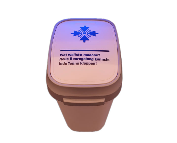 Seit Jahresanfang muss bei jedem Kauf ein Kassenbon gedruckt werden, auch wenn die Kunden gar nicht wollen. Die Buchhandlung Gossens nimmt es mit Humor und setzt ein Statement – mit einem kleinen Abfalleimer.