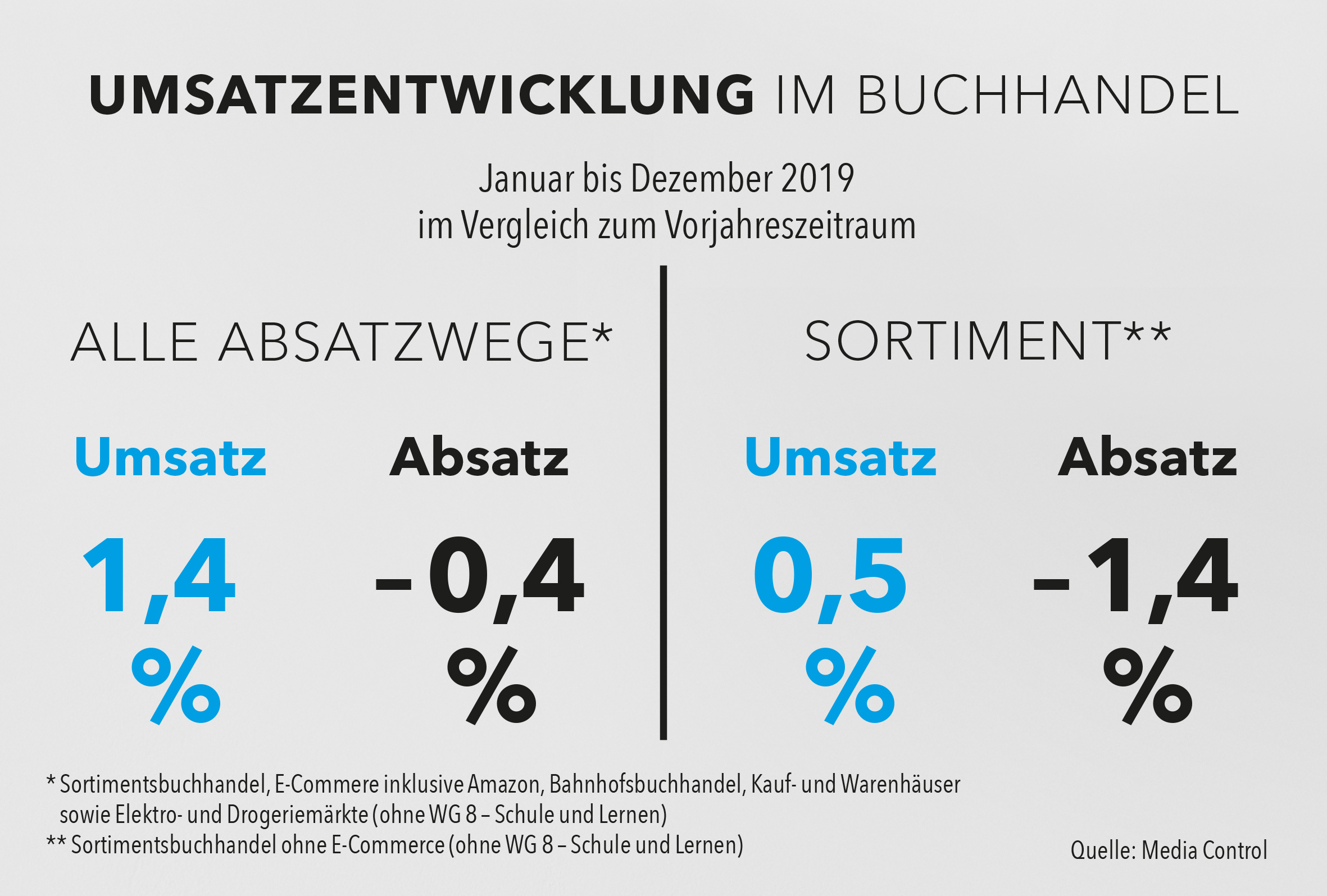 Doch statt noch das eine oder andere Prozentpünktchen draufzusatteln, schmolz das Polster im Dezember ab. Allen Vertriebswegen gemeinsam (Sortiment, E-Commerce inklusive Amazon, Bahnhofsbuchhandel, Kauf- und Warenhäuser, Lebensmitteleinzelhandel, Elektro- und Drogeriemärkte) fehlten in Summe 2,1 Prozent zum Dezemberergebnis des Vorjahres, im stationären Buchhandel waren es sogar 3,7 Prozent. Details dazu gibt es am Ende des Textes. Jetzt wird erst einmal Kassensturz für das Gesamtjahr 2019 gemacht, mit dem die Branche insgesamt zufrieden sein kann: Nach zwölf Monaten steht unter dem Strich ein Umsatzanstieg von 1,4 Prozent über alle Absatzkanäle hinweg (2018: plus 0,1 Prozent). Auch die Umsatzentwicklung im Sortiment drehte diesmal mit 0,5 Prozent ins Plus (2018: minus 0,6 Prozent).