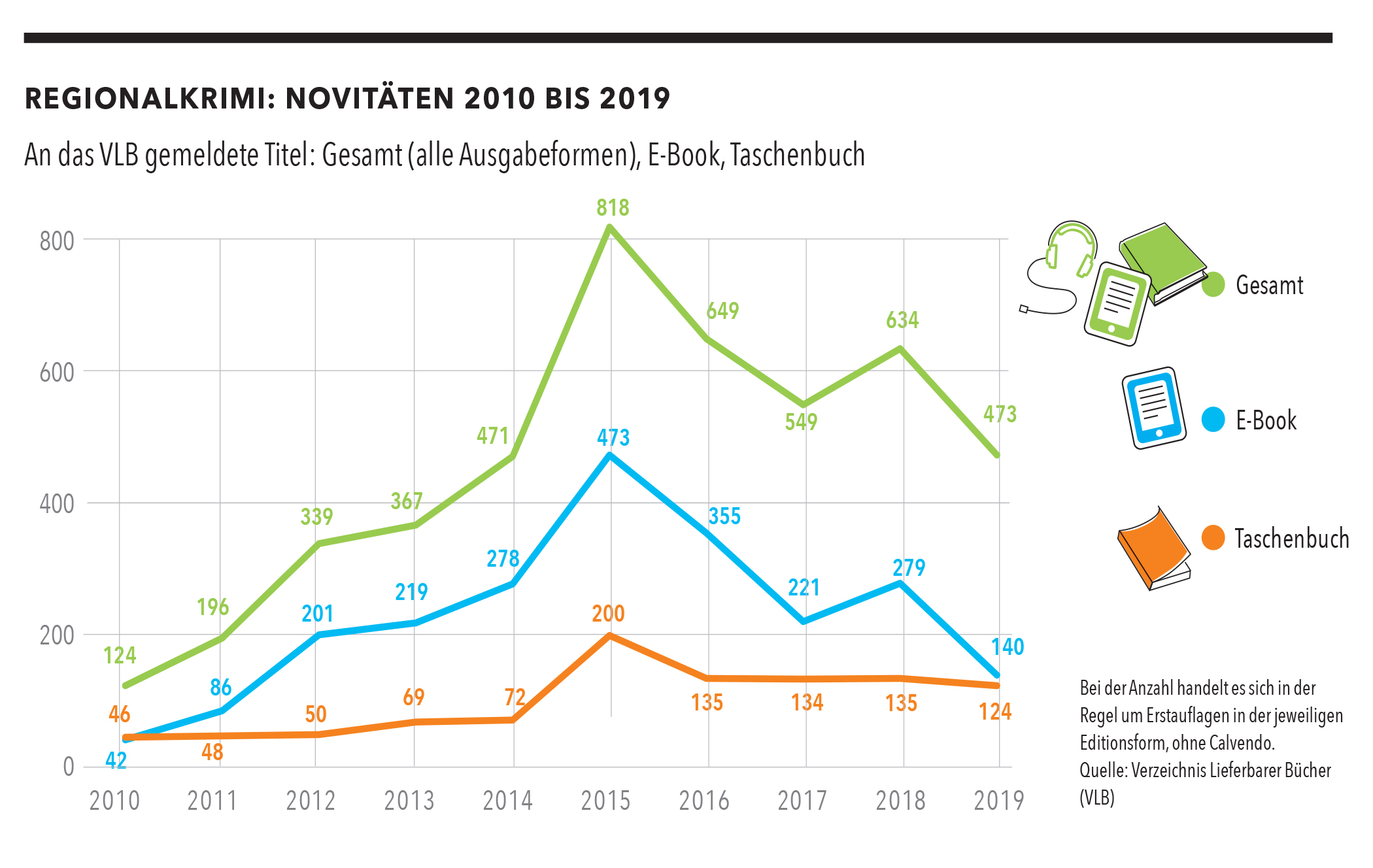 Für den bisherigen Höhepunkt sorgte das Jahr 2015, in dem in allen Ausgabeformaten 818 Erstausgaben von Regionalkrimis erschienen, davon allein 473 E-Books. Das war zu einem Zeitpunkt, als der Leserschwund auf dem deutschen Markt noch nicht so sichtbar war wie zwei Jahre später.