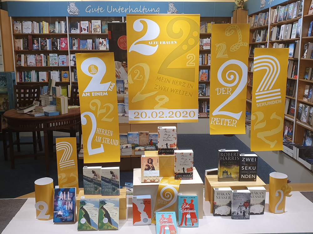 Mit einem befreundeten Grafiker hat sie in goldgelben Tönen verschiedenformatige Deckenhänger entworfen, die auf die Ziffer 2 und und entsprechende Buchtitel hinweisen. Die Titel fürs Schaufenster hat Henze gemeinsam mit ihrer Kollegin ausgesucht: