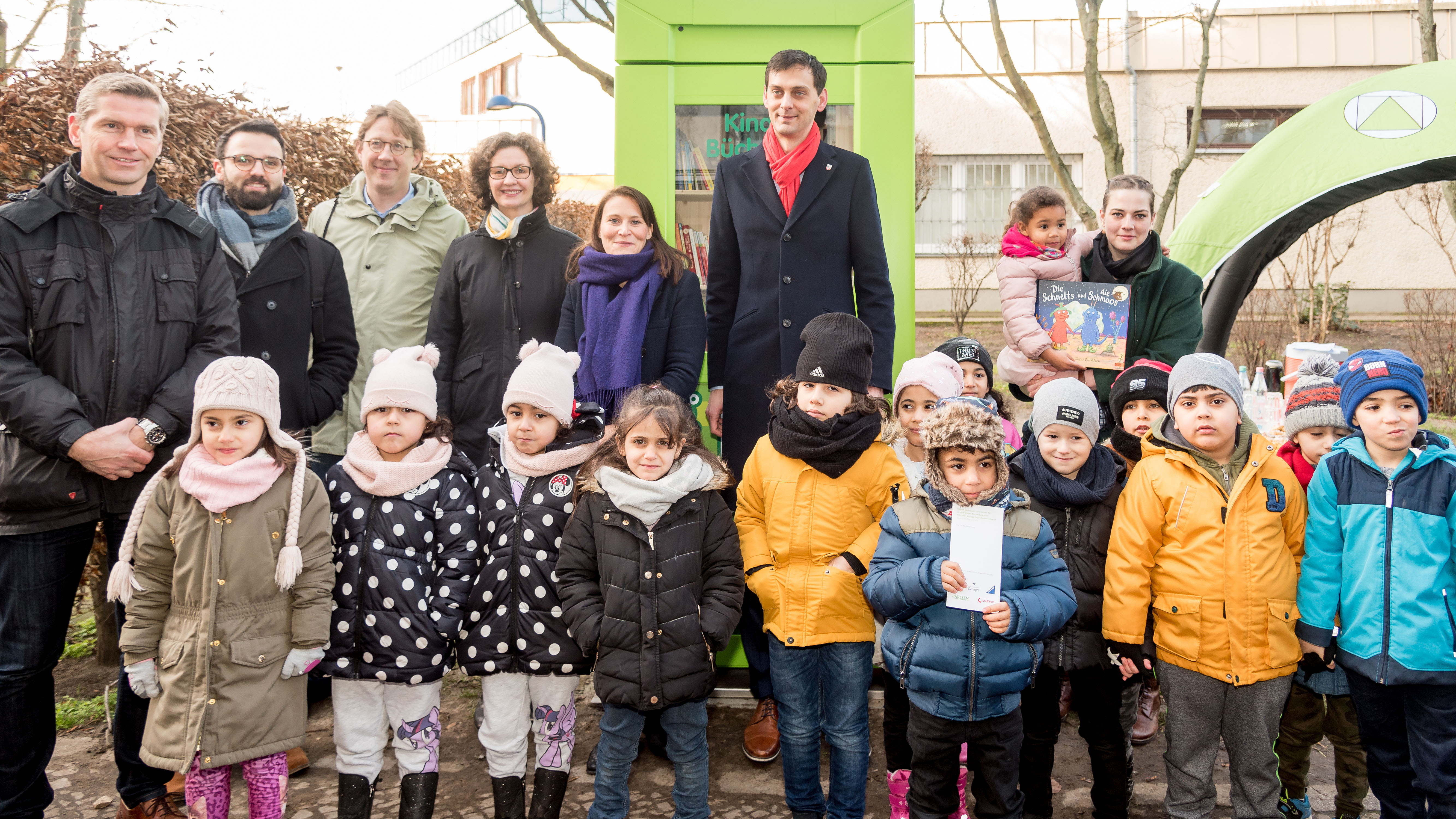 Neuköllns Bezirksbürgermeister Martin Hikel hat am Donnerstag gemeinsam mit den Kindern die Kinder-Bücherbox eingeweiht. Die umgebaute Telefonzelle wurde mit ausgewählten Kinderbüchern in verschiedenen Sprachen ausgestattet. Kinder und Familien des Kindergartens, der benachbarten Grundschule und der Nachbarschaft können ihre ausgelesenen Kinder- und Jugendbücher hineinstellen und sich dafür neue mitnehmen. „Die Kinder-Bücherbox ist eine echte Bereicherung für den Kiez. Kinder lieben Bücher, auch und vielleicht gerade in Zeiten digitaler Medien. Besonders freue ich mich über die große Wertschätzung, die den vielsprachigen Familien in der High-Deck-Siedlung mit der Auswahl hochwertiger Kinderbücher in verschiedenen Sprachen entgegengebracht wird. Ich bin sicher, dass das Angebot an diesem Standort sehr gut angenommen wird“, so Hikel. Im Anschluss an die Einweihung las er den Kindern im Kindergarten aus ihren Lieblingsbüchern vor.