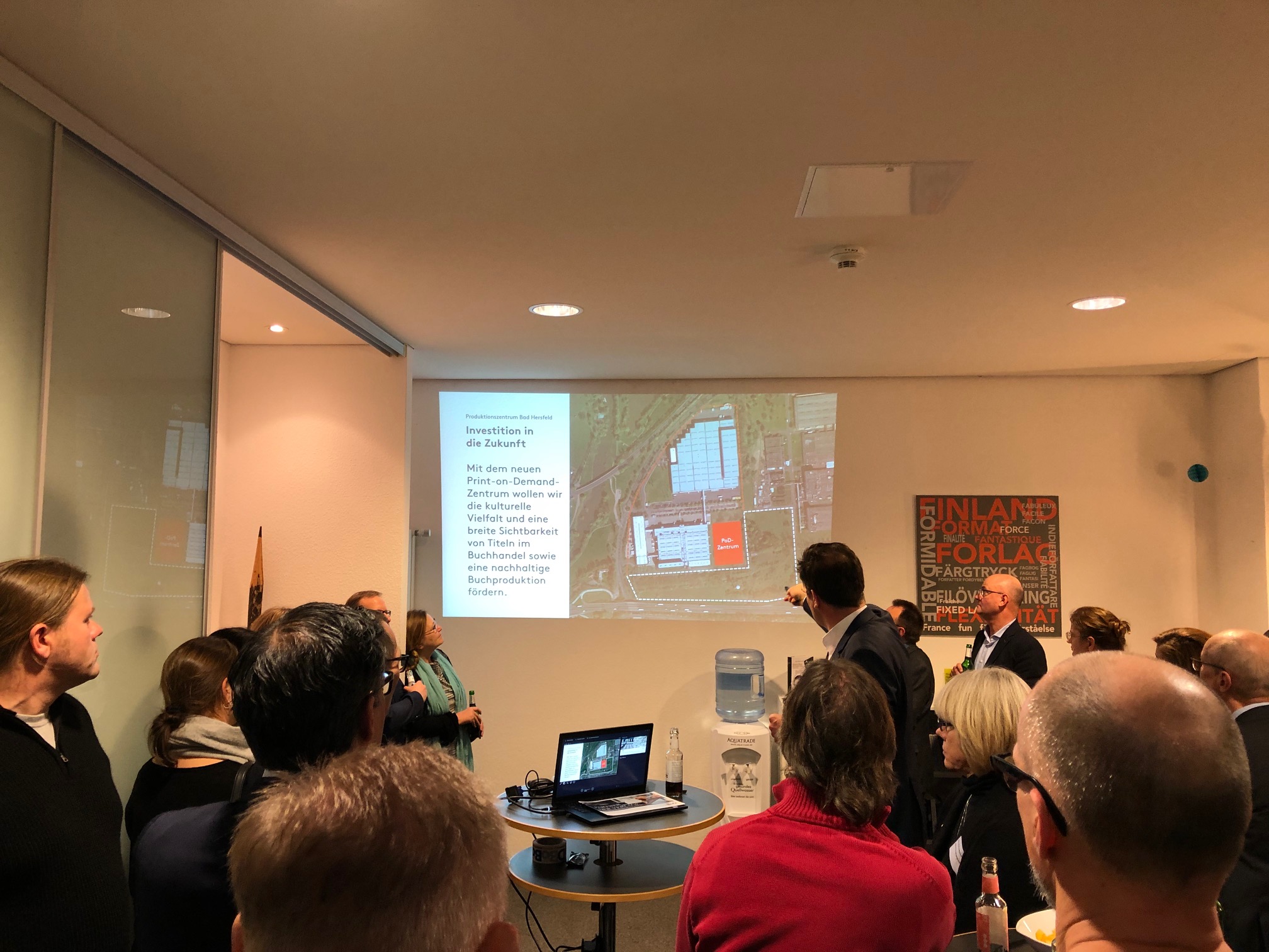 Nachdem die BoD-Mitarbeiter Oliver Schnoor und Karsten Kaufmann die Entwicklung und Strategie ihres Unternehmens vorgestellt hatten, ging es im Anschluss per Shuttle in die Produktionsanlage in Norderstedt. Mit dabei war auch Jörg Zaag, Pionier der ersten Stunde, der BoD zunächst als eigene Abteilung unter dem Dach von Libri aufgebaut hatte.